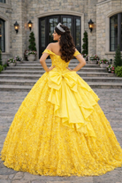 Radiant and regal, this sunshine yellow quinceañera gown captures the essence of royal celebration. The off-shoulder sweetheart corset bodice is adorned with intricate 3D floral appliqué and delicate shimmer detailing, sculpting the waist with couture precision. The voluminous glitter tulle skirt blooms with layered floral texture, creating a breathtaking princess silhouette with luminous movement.