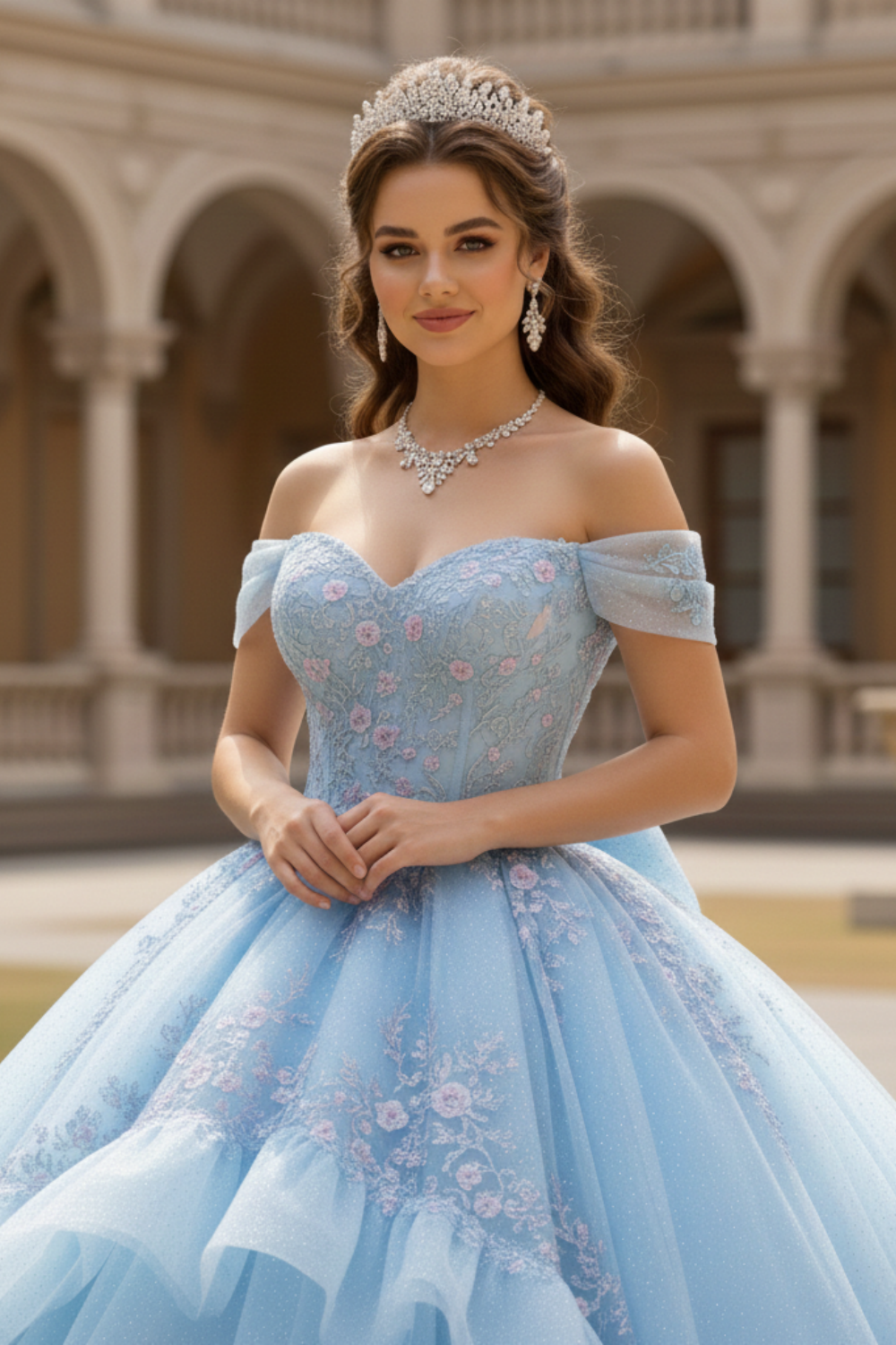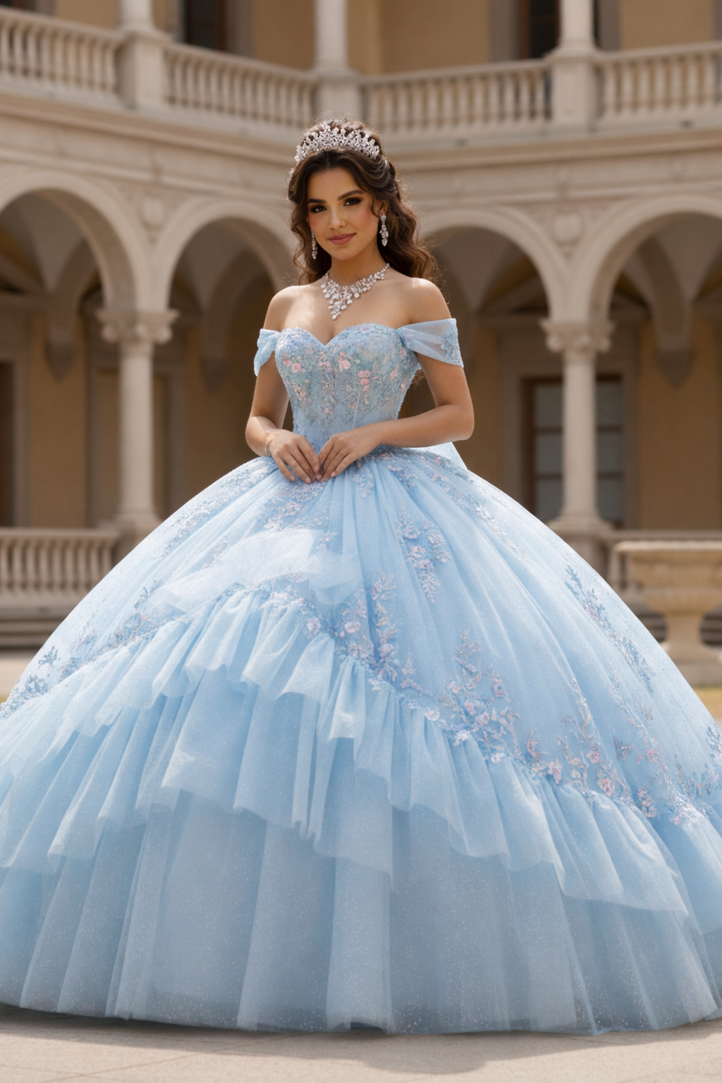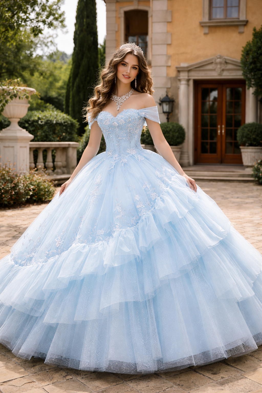 Sky Blue Off-Shoulder Corset Ball Gown with Layered Tulle Skirt – Quinceanera Dresses
