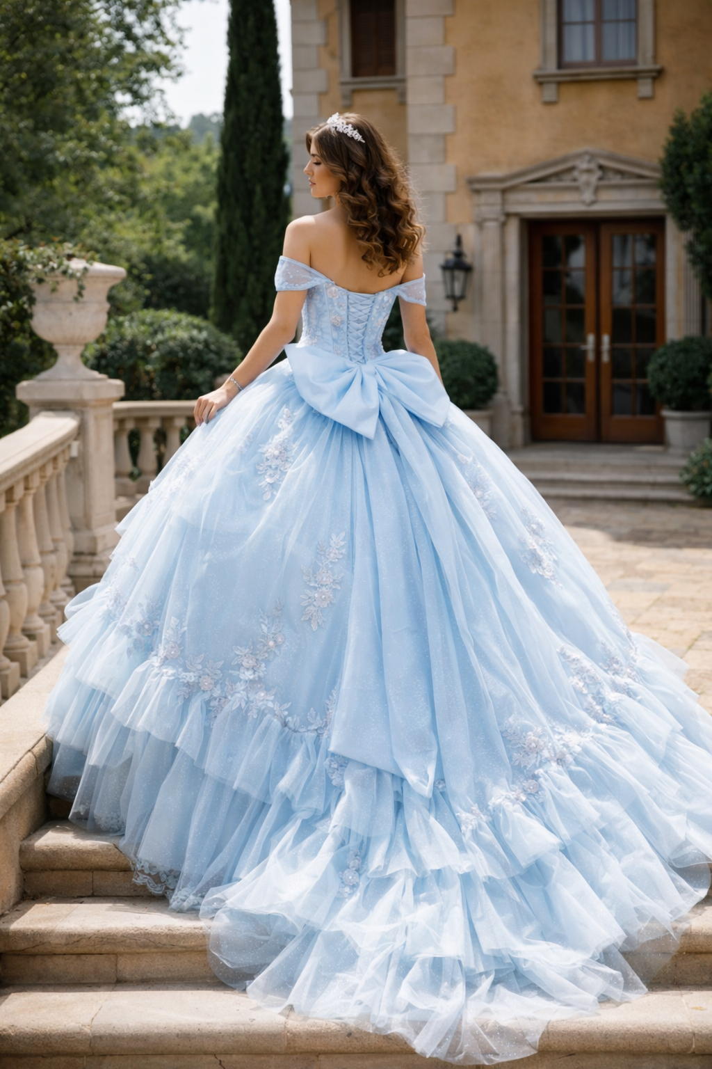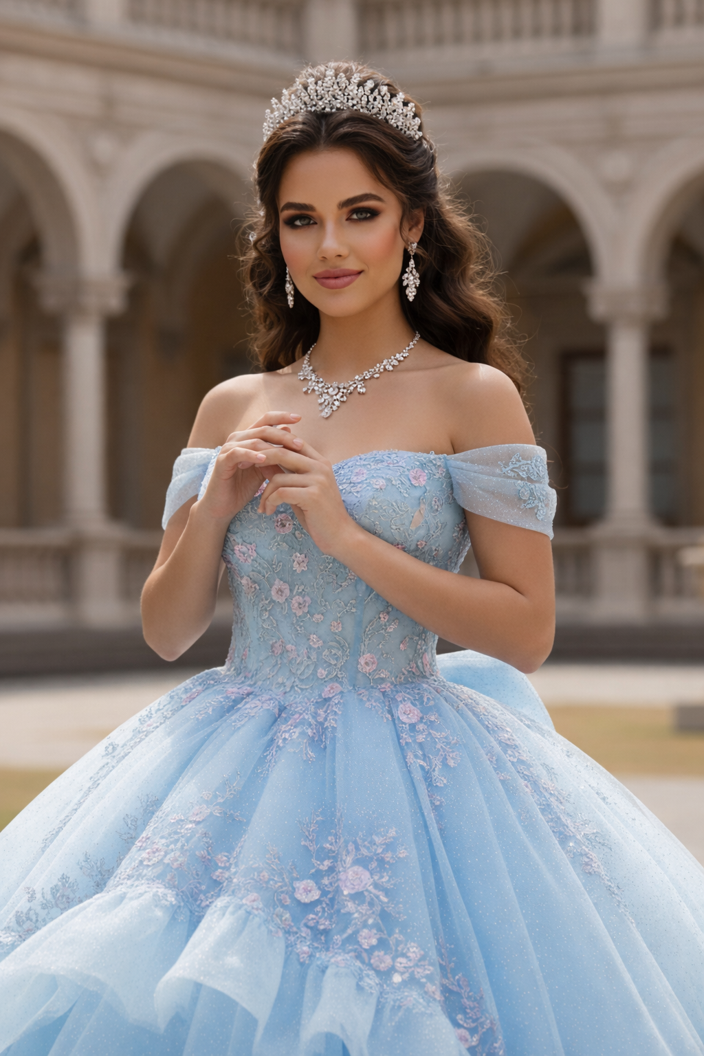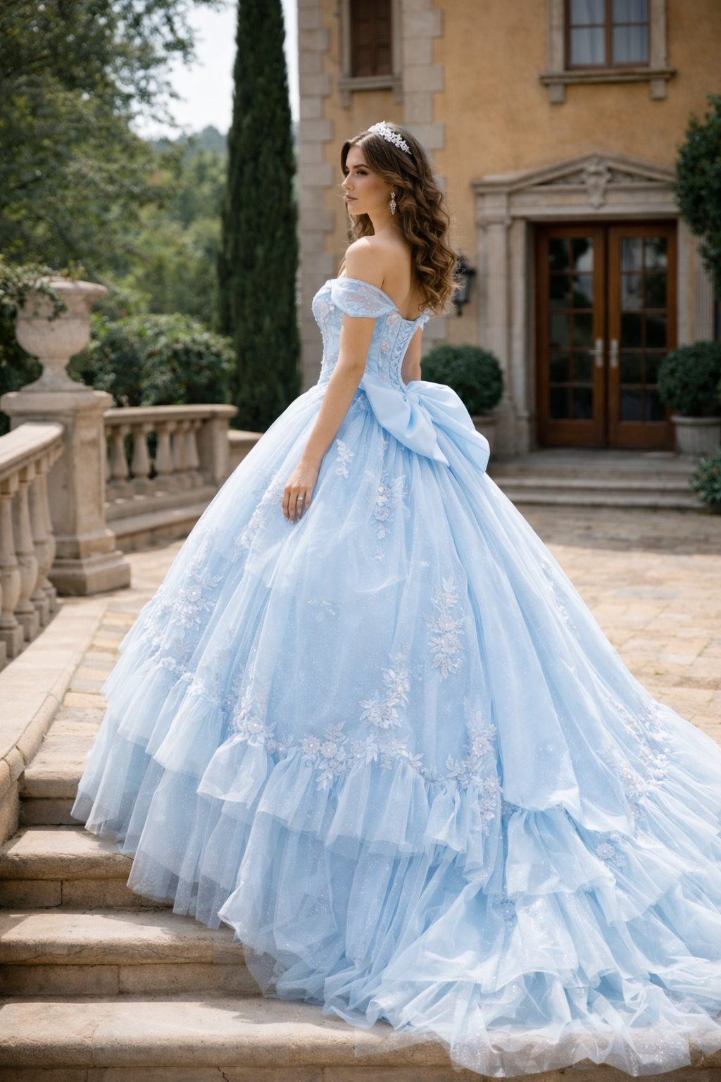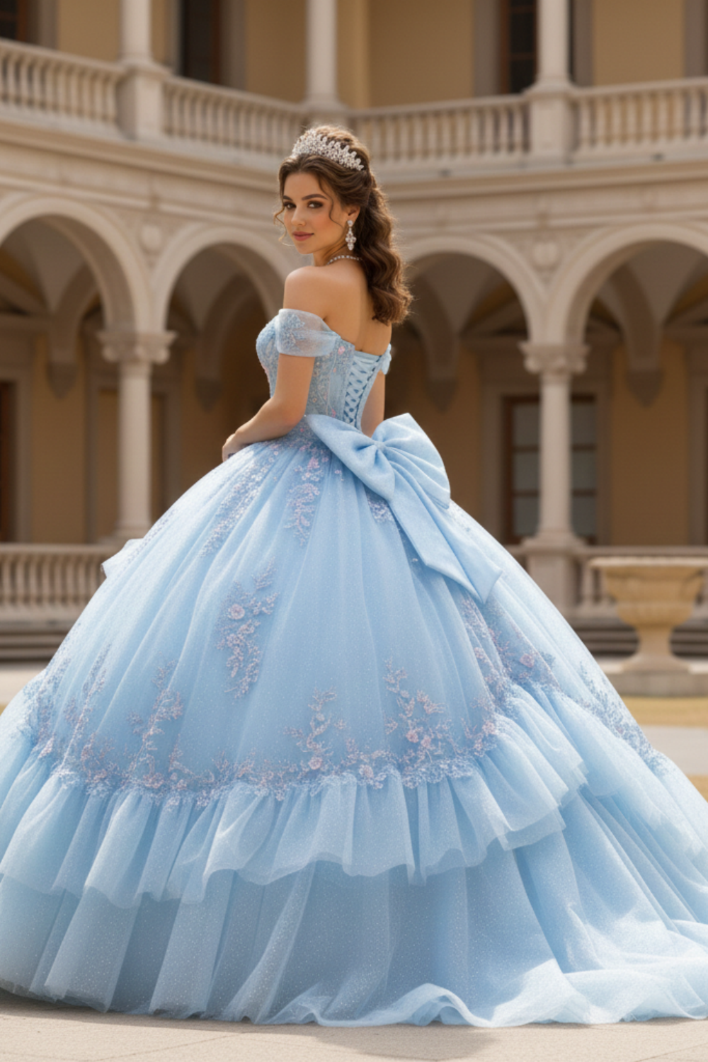 Sky Blue Off-Shoulder Corset Ball Gown with Layered Tulle Skirt – Quinceanera Dresses