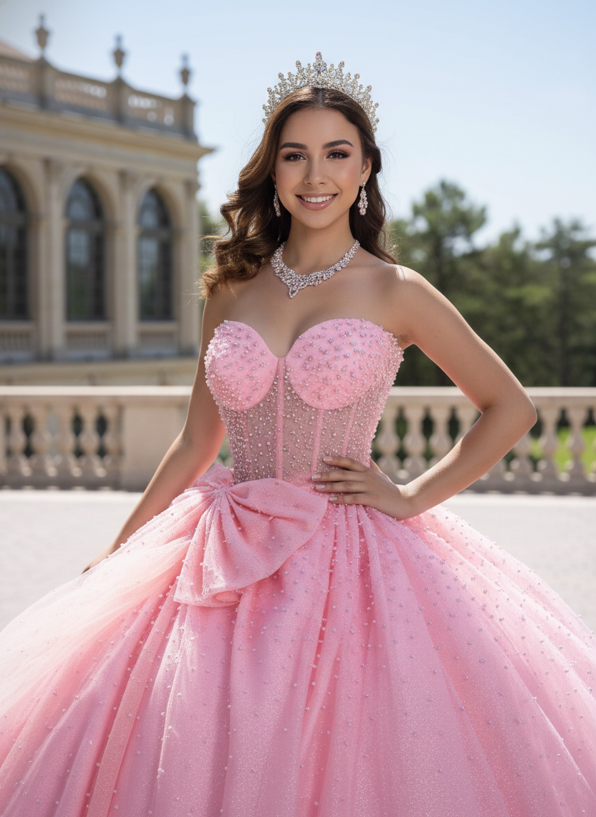 Sweetheart Pink Glitter Tulle Corset Princess Ball Gown with Bow Detail Quinceanera Dresses