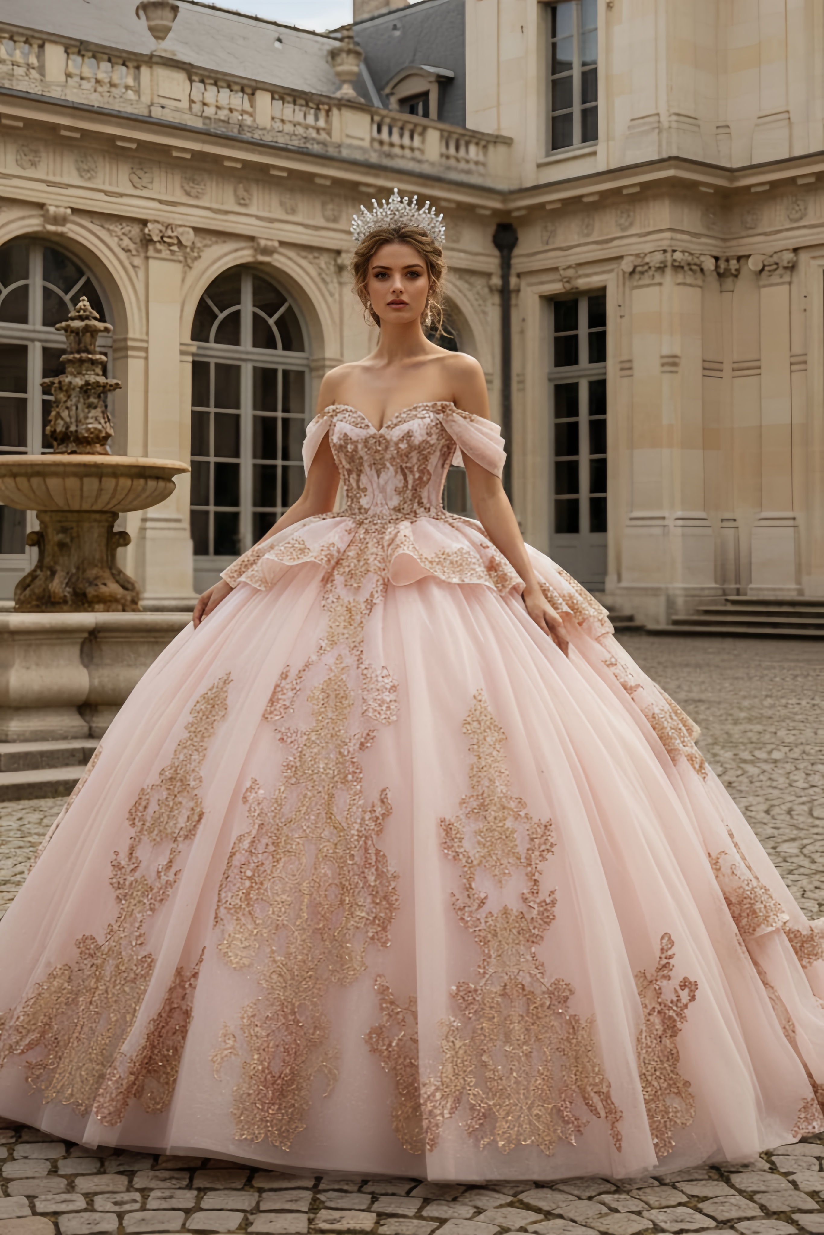 Blush & Gold Royal Embroidery Princess Ball Gown Quinceanera Dresses