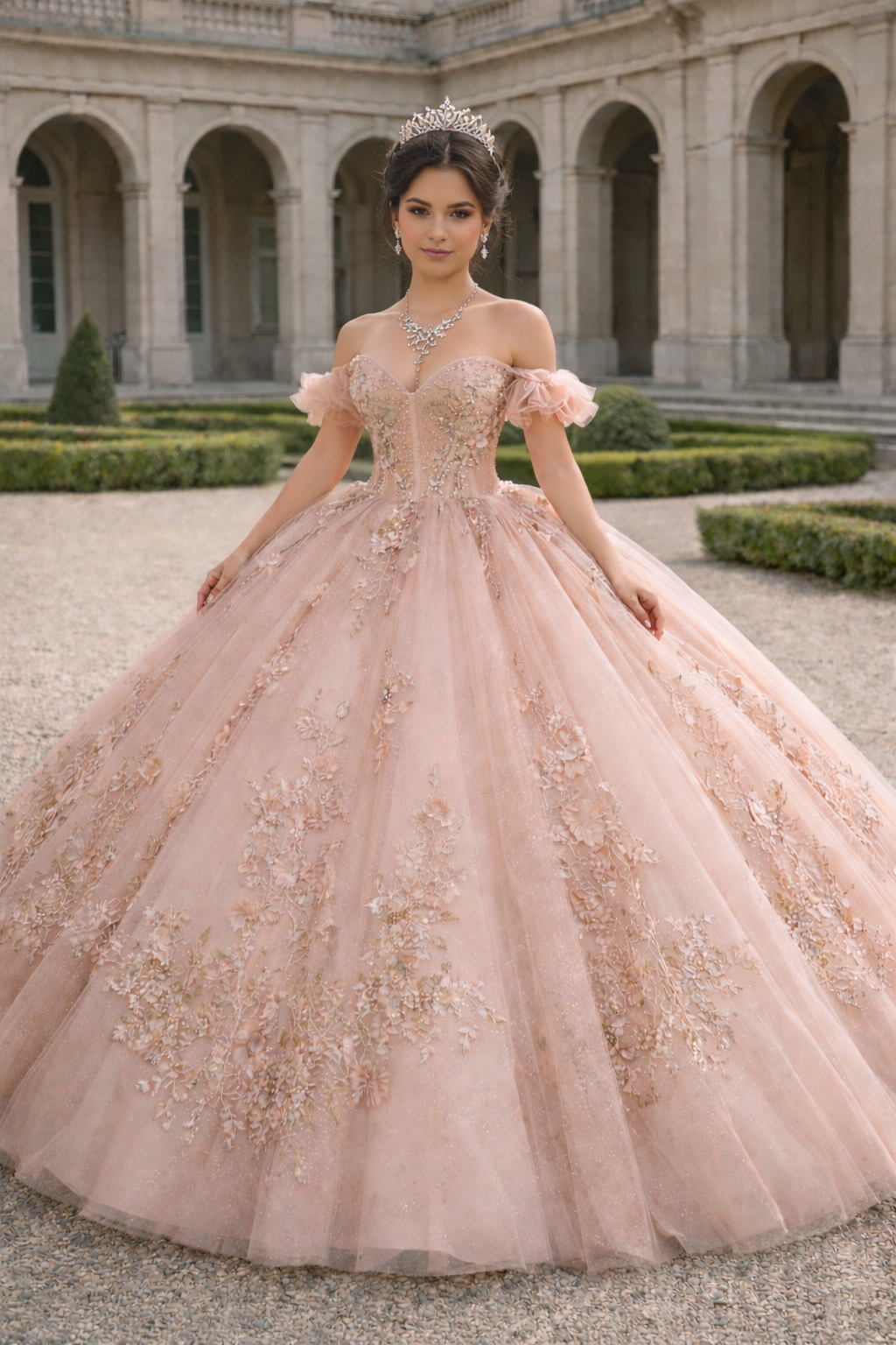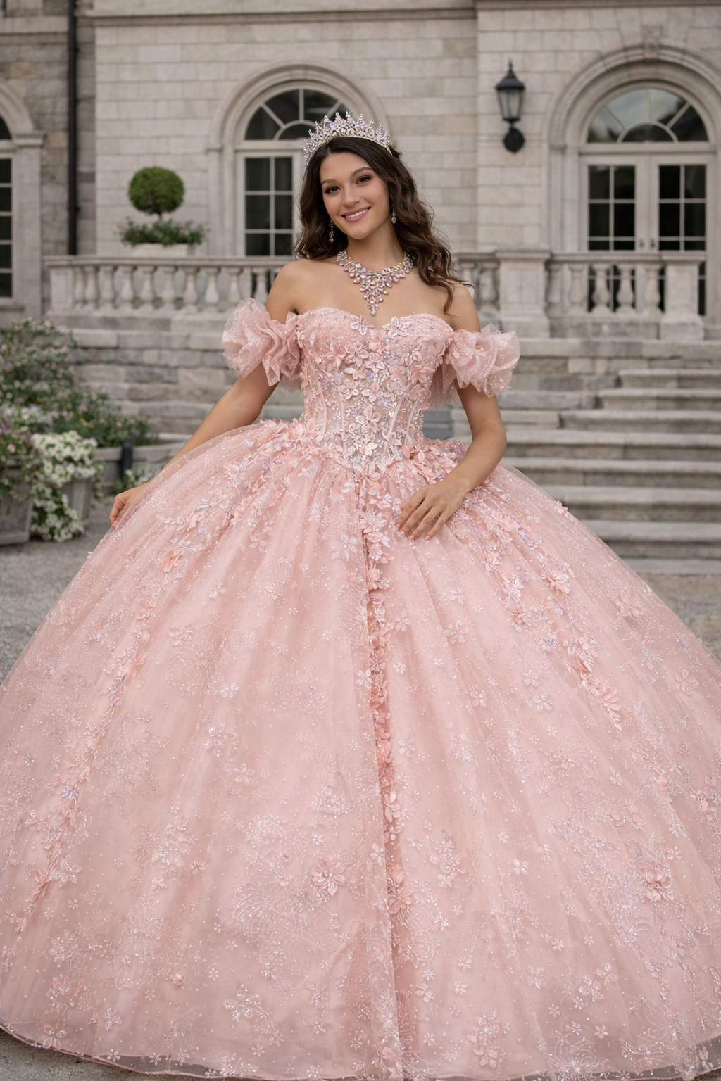 Blush 3D Floral Off-Shoulder Princess Ball Gown Quinceanera Dresses