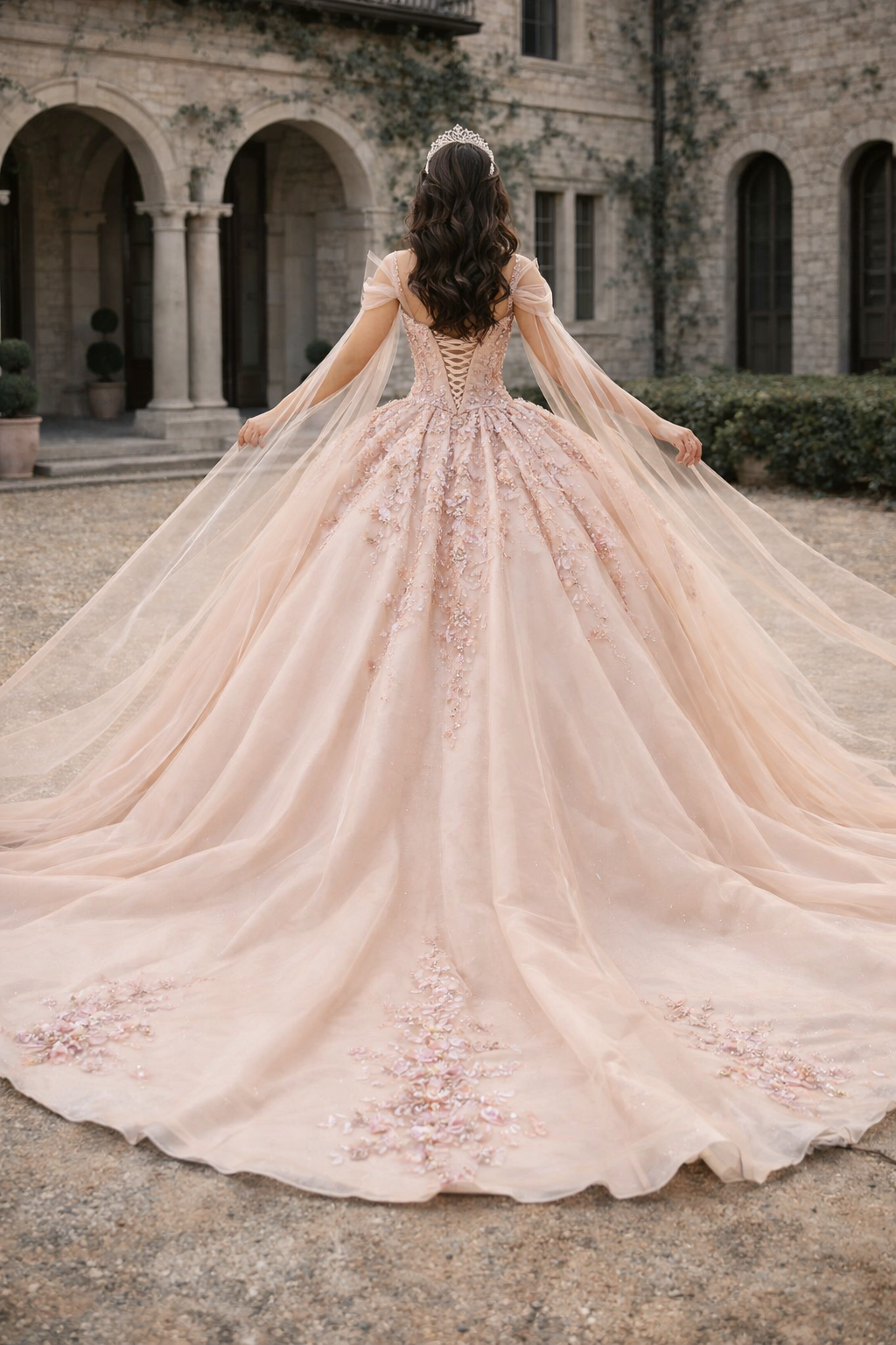 Blush Champagne Embroidered Princess Ball Gown with Cape – Quinceanera Dresses