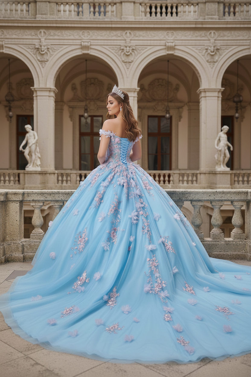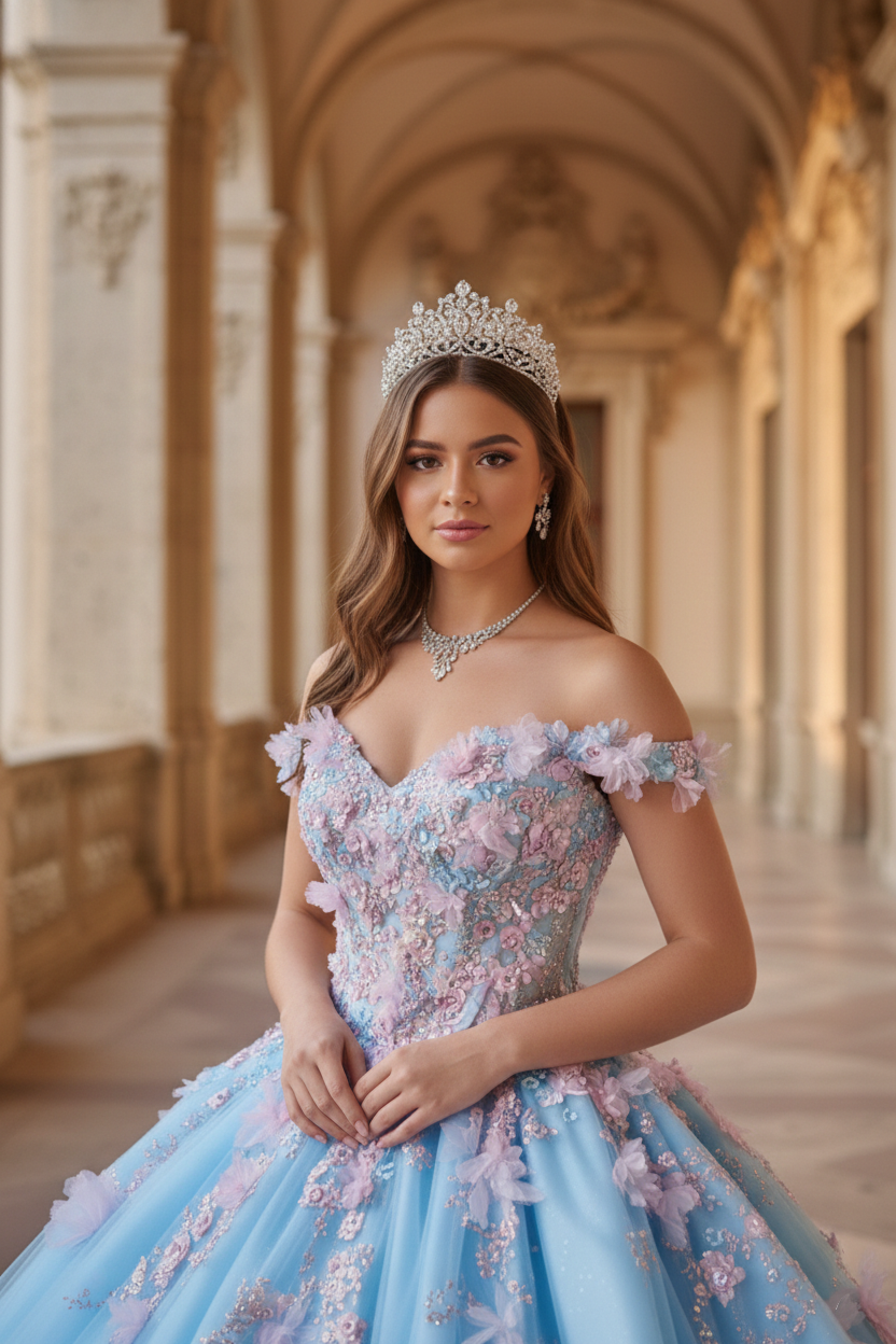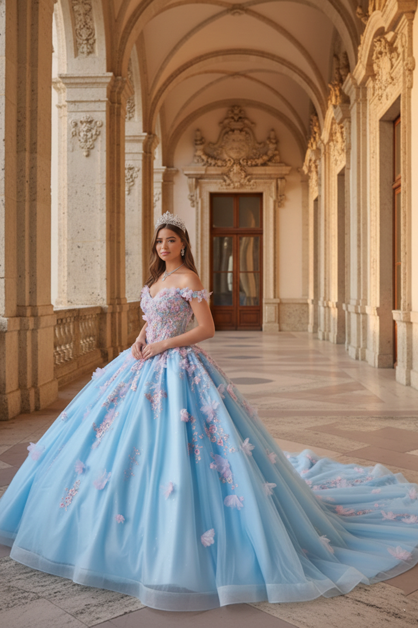 Blush Champagne & Sky Blue 3D Floral Off-Shoulder Corset Ball Gown with Open Lace-Up Back – Quinceanera Dresses