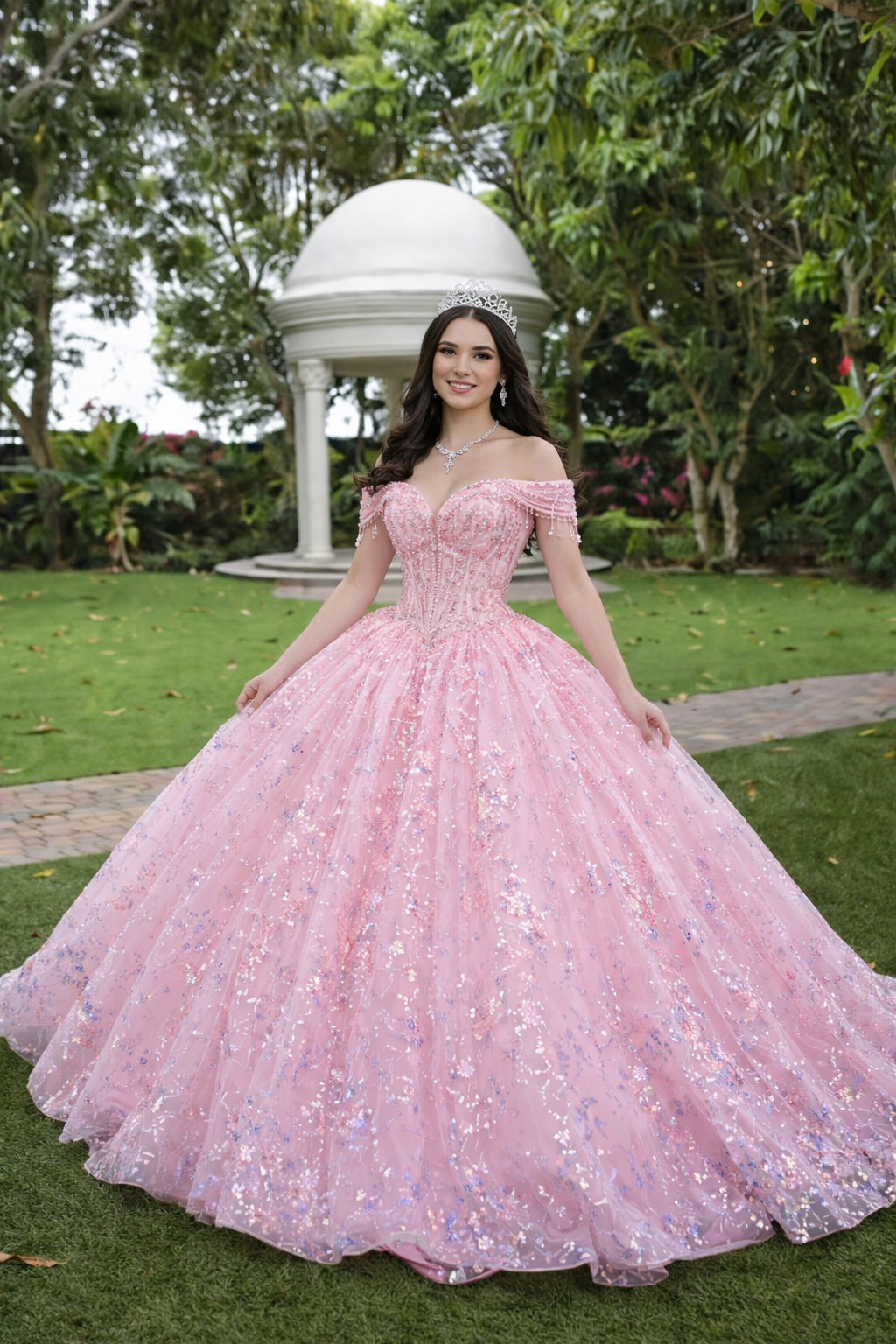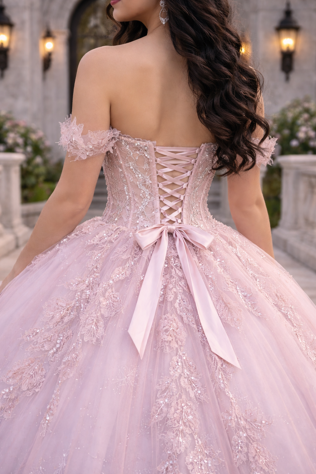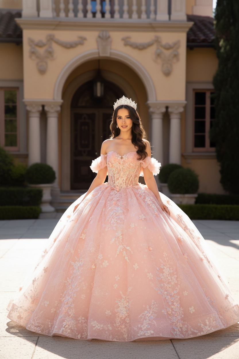 Blush Pink Glitter Princess Corset Ball Gown with Romantic Off-Shoulder Sleeves & Open Lace-Up Back – Quinceanera Dresses