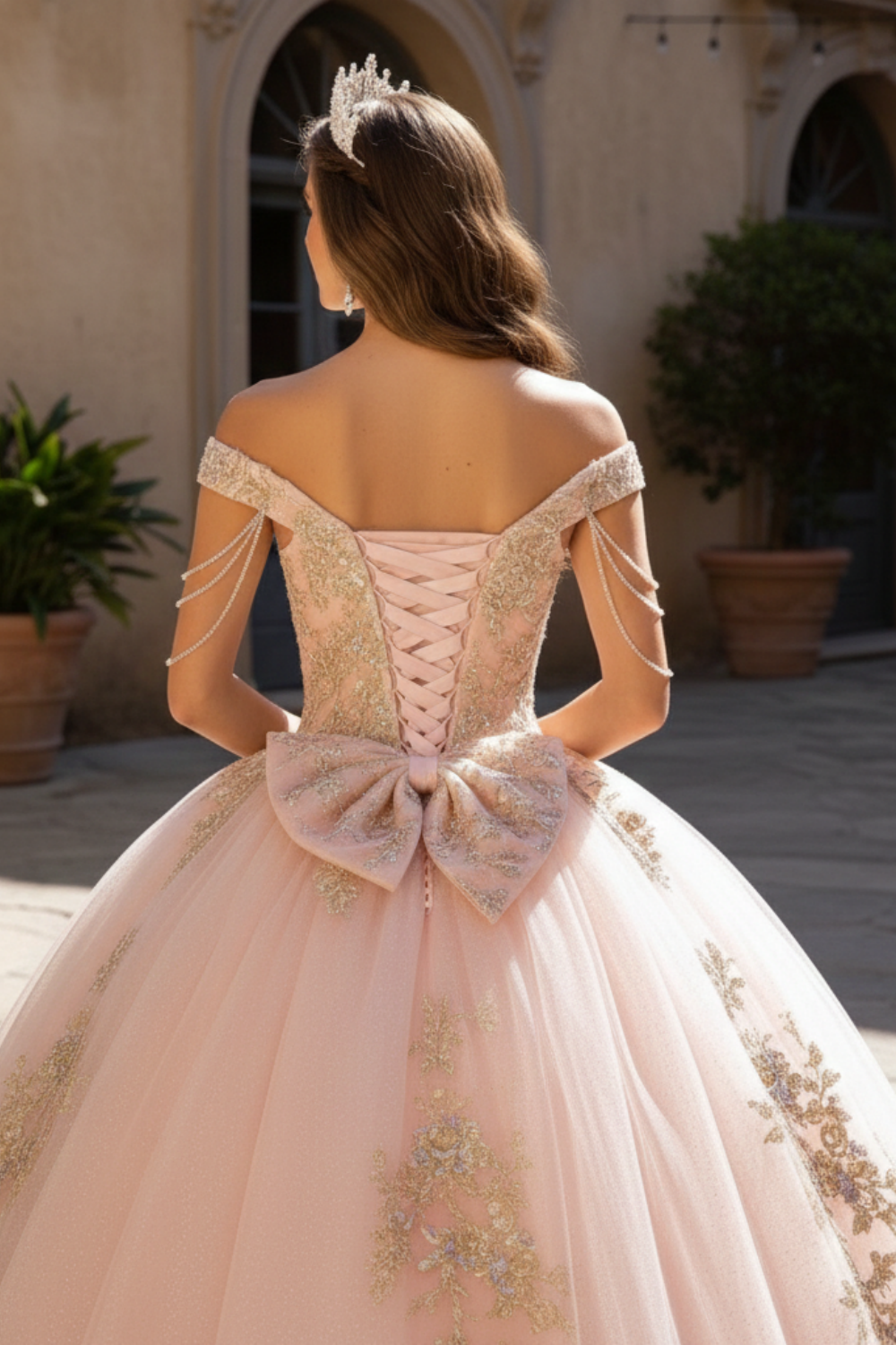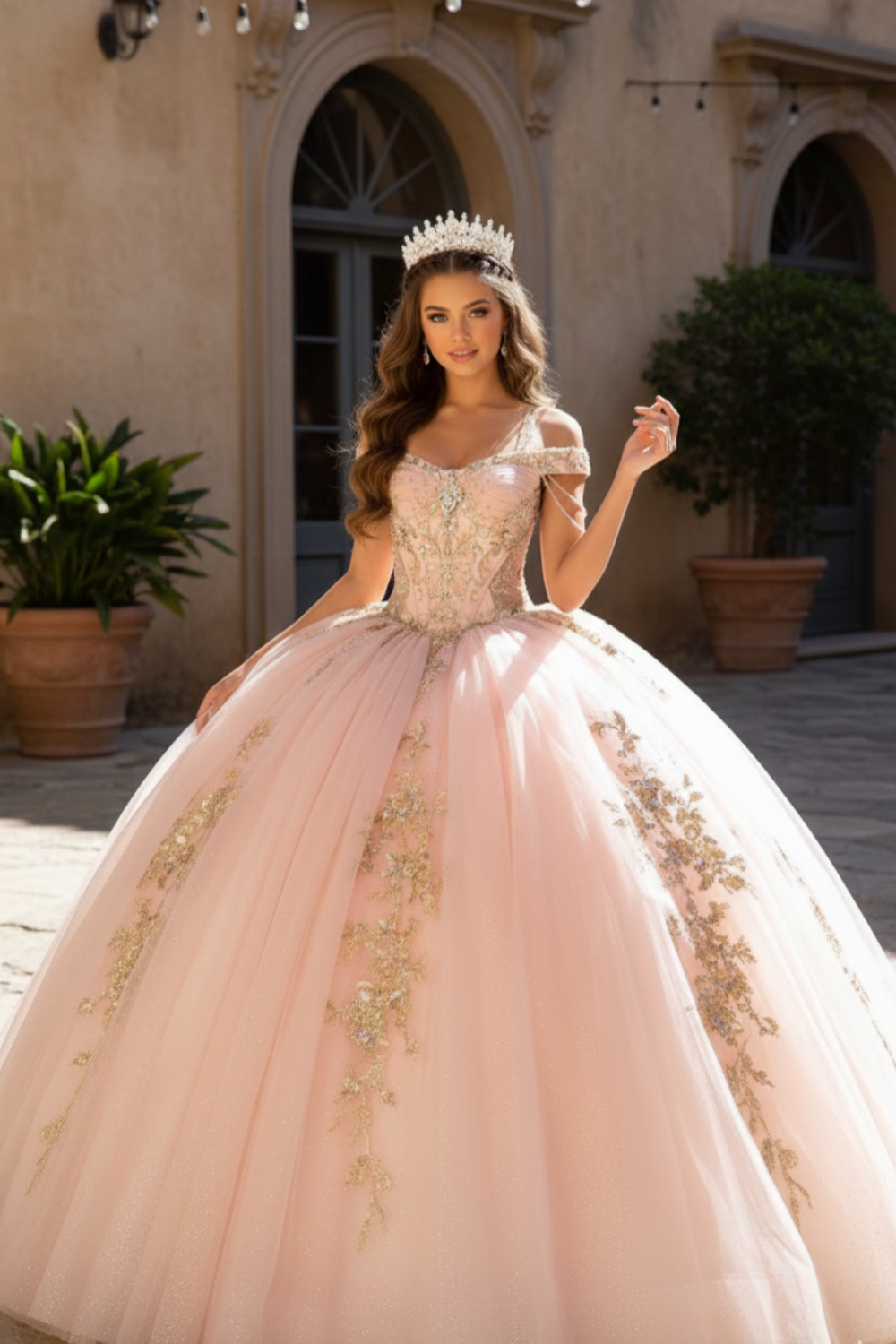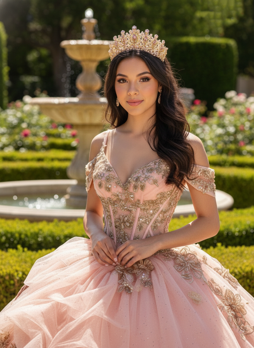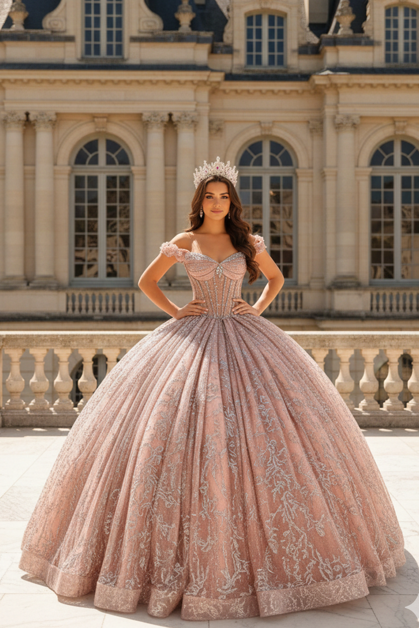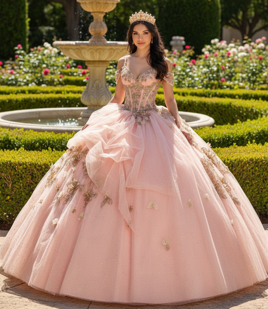 Blush Pink Glitter Corset Ball Gown with Gold Lace & Off-Shoulder Straps – Quinceanera Dresses