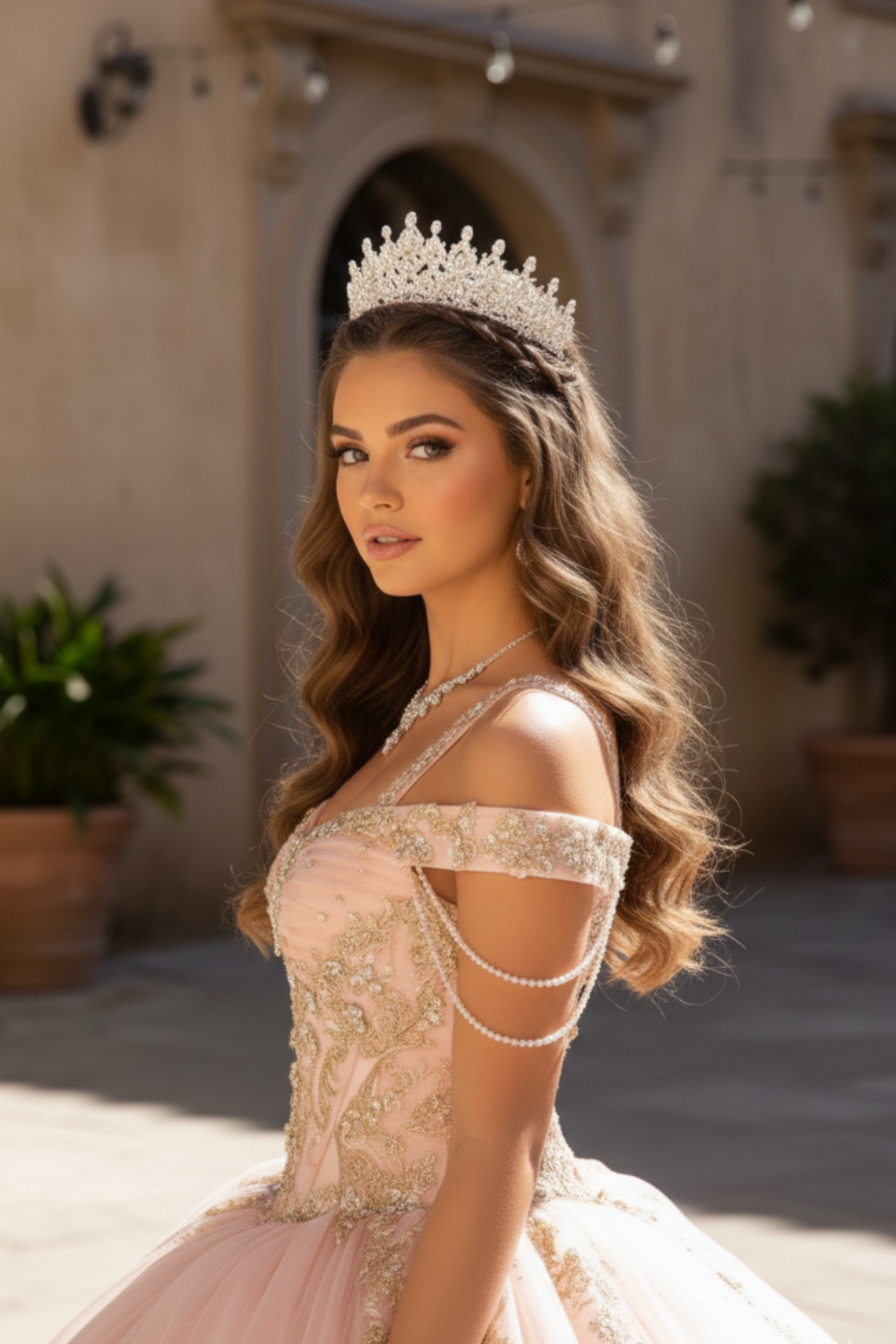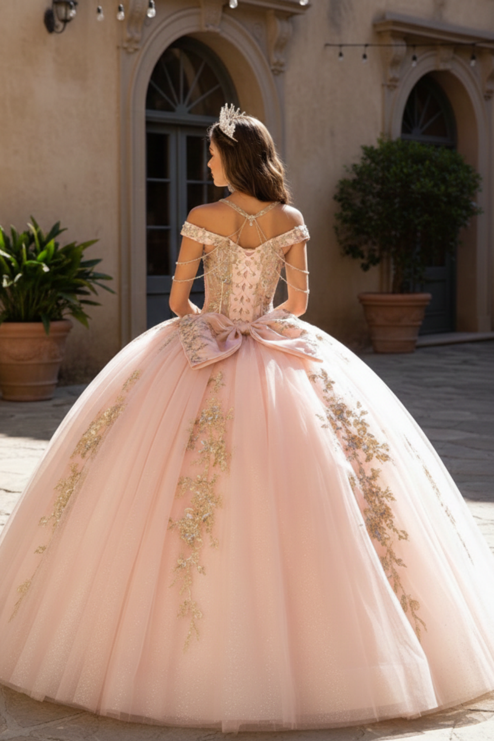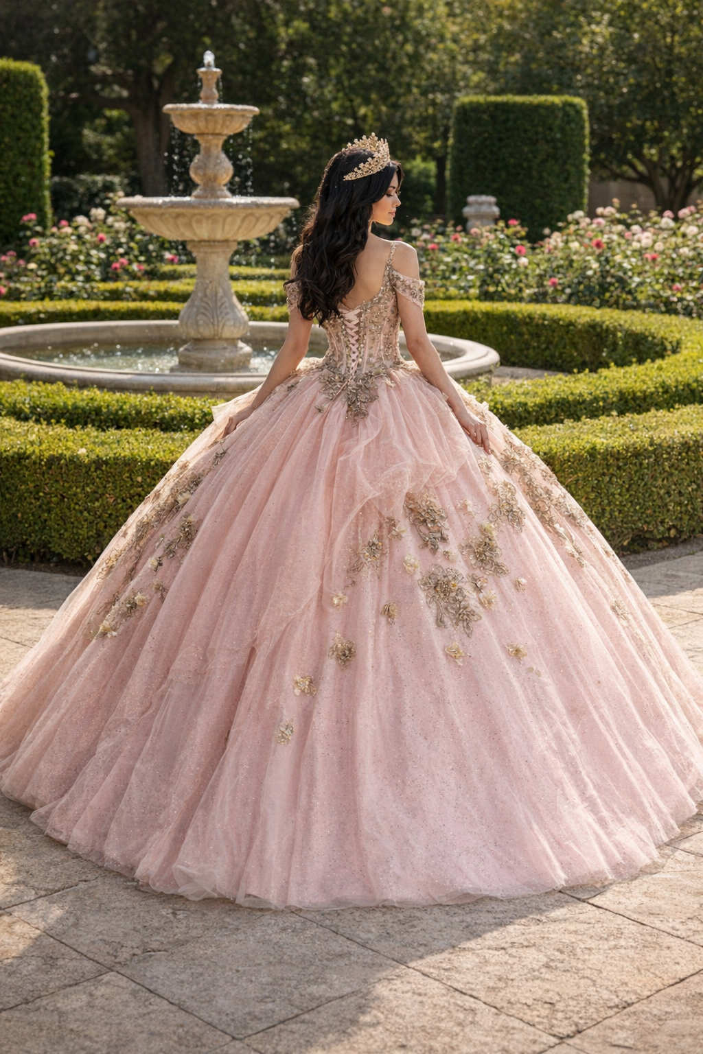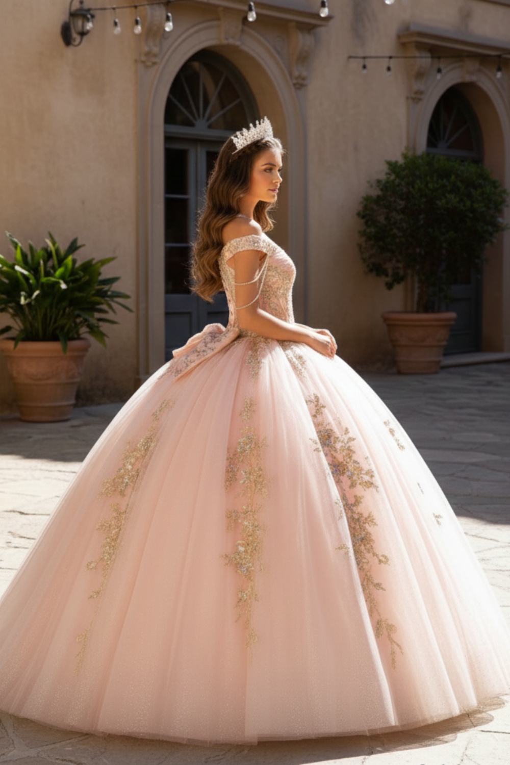 Blush Pink Glitter Corset Ball Gown with Gold Lace & Off-Shoulder Straps – Quinceanera Dresses