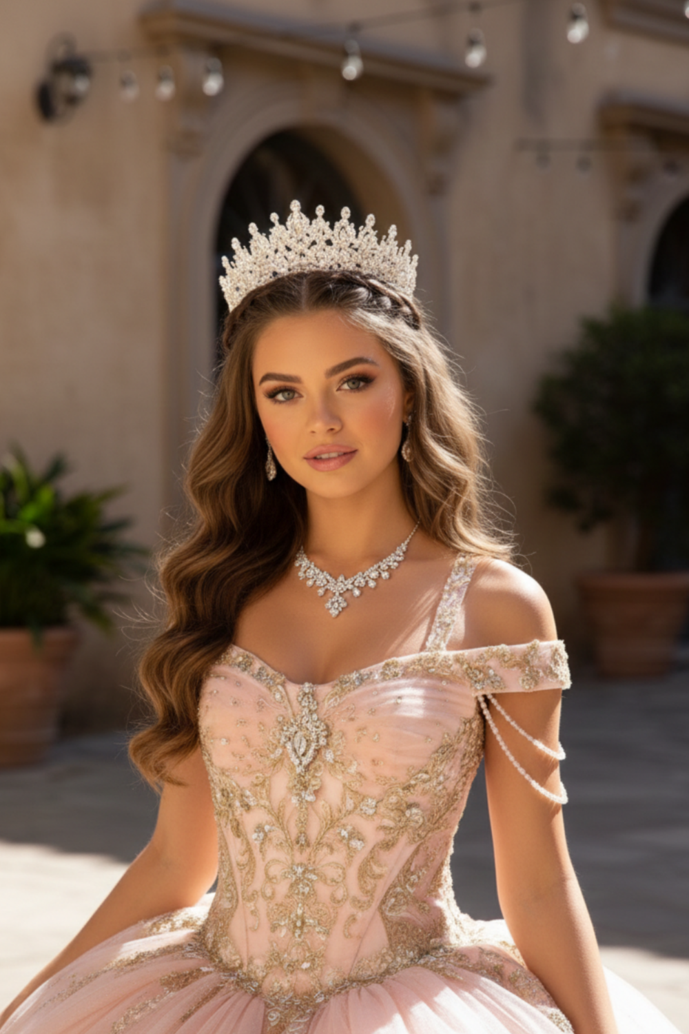 Blush Pink & Champagne Crystal Corset Princess Ball Gown with Open Lace-Up Back – Quinceanera Dresses