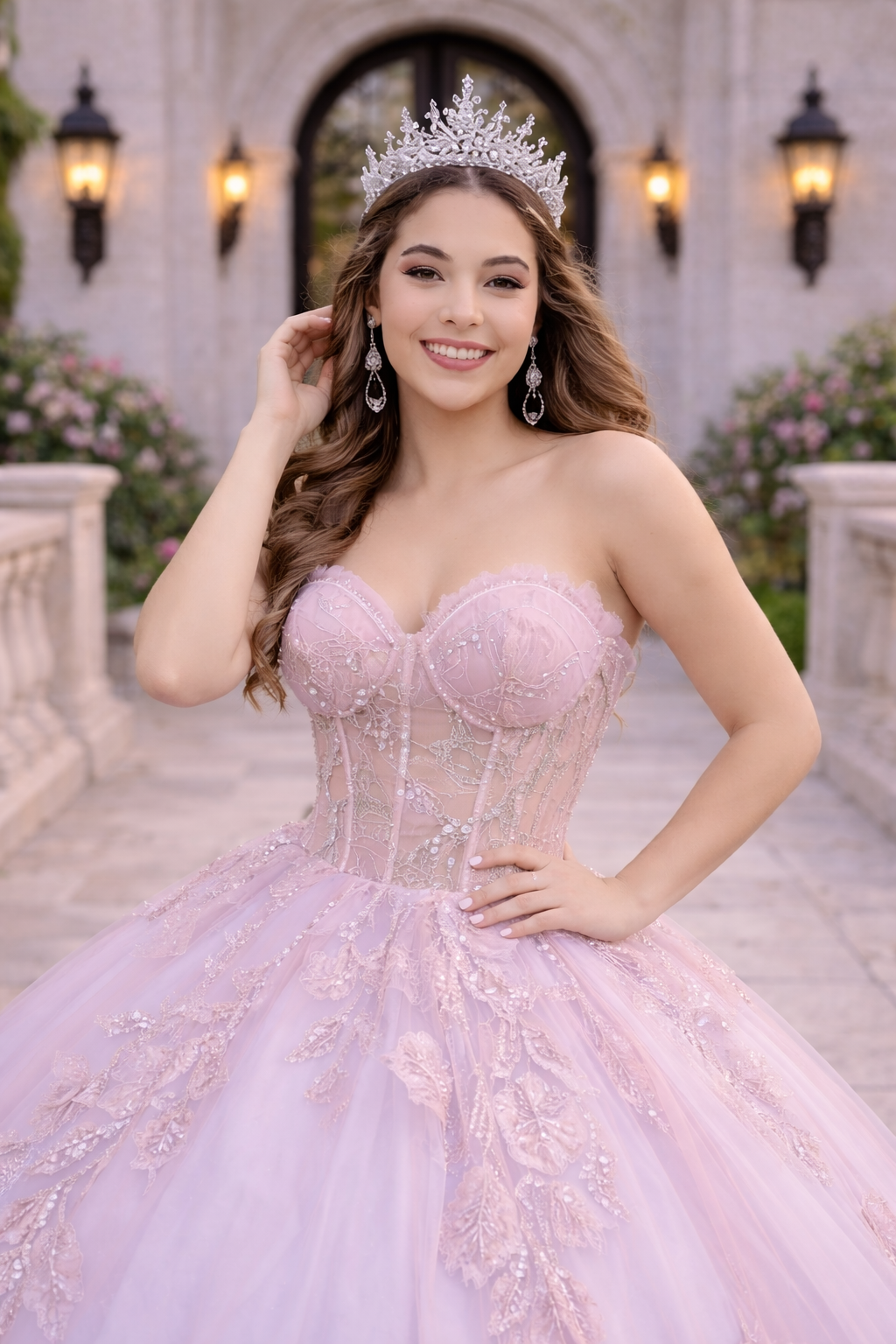 Blush Pink Lace Corset Ball Gown with Embroidered Tulle Skirt – Quinceanera Dresses
