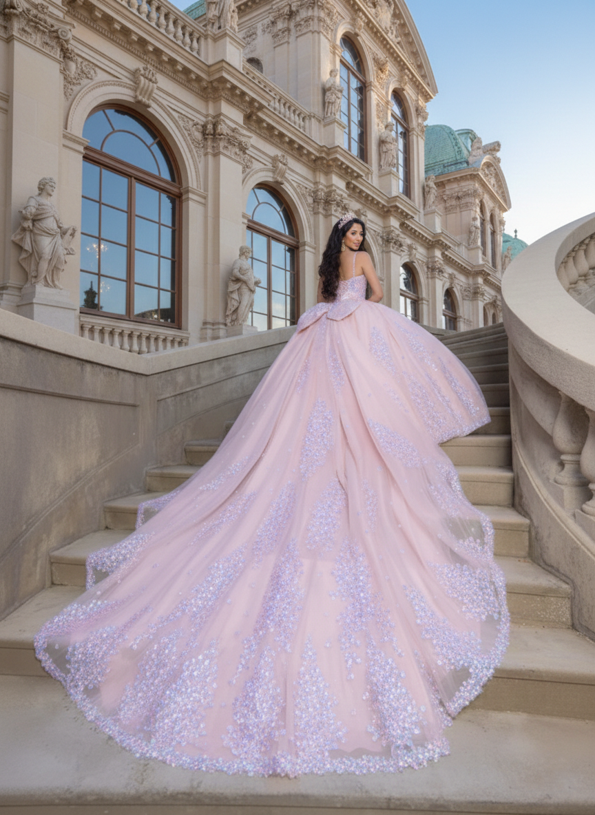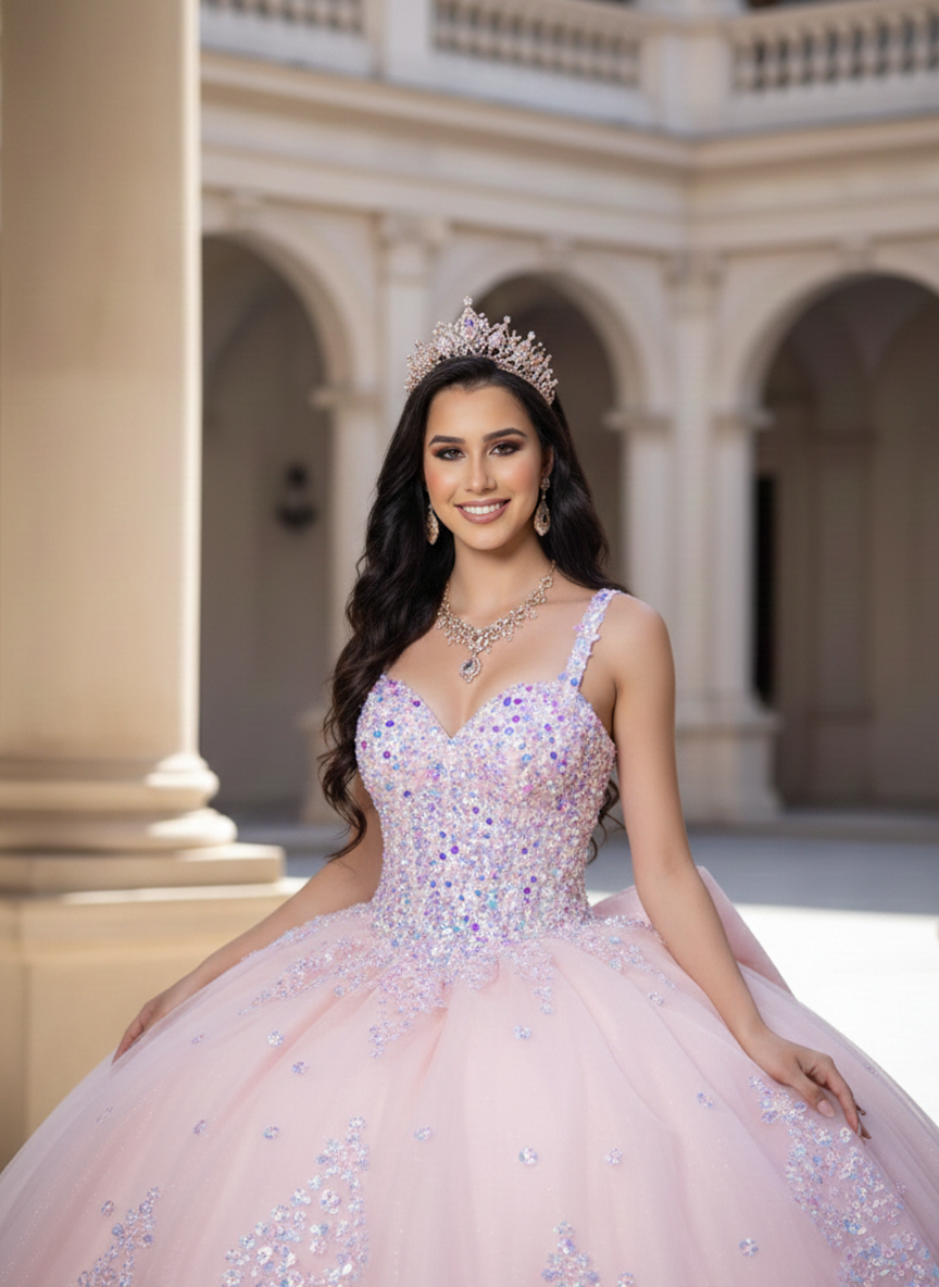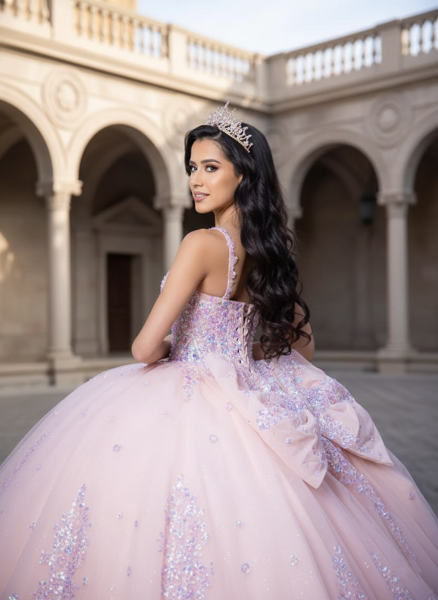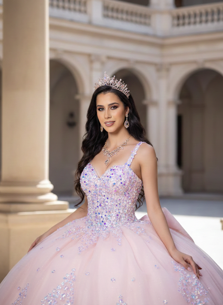 Blush Pink Glitter Corset Ball Gown with Open Lace-Up Back – Quinceanera Dresses