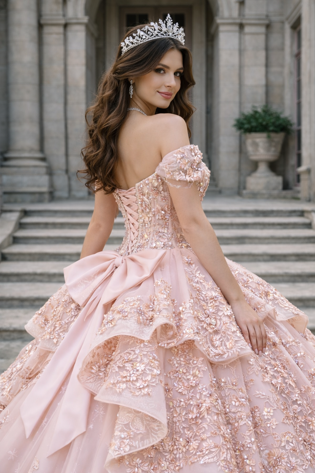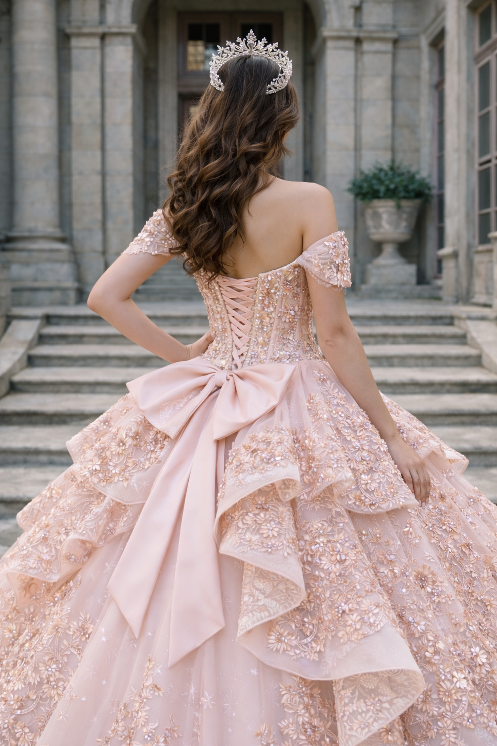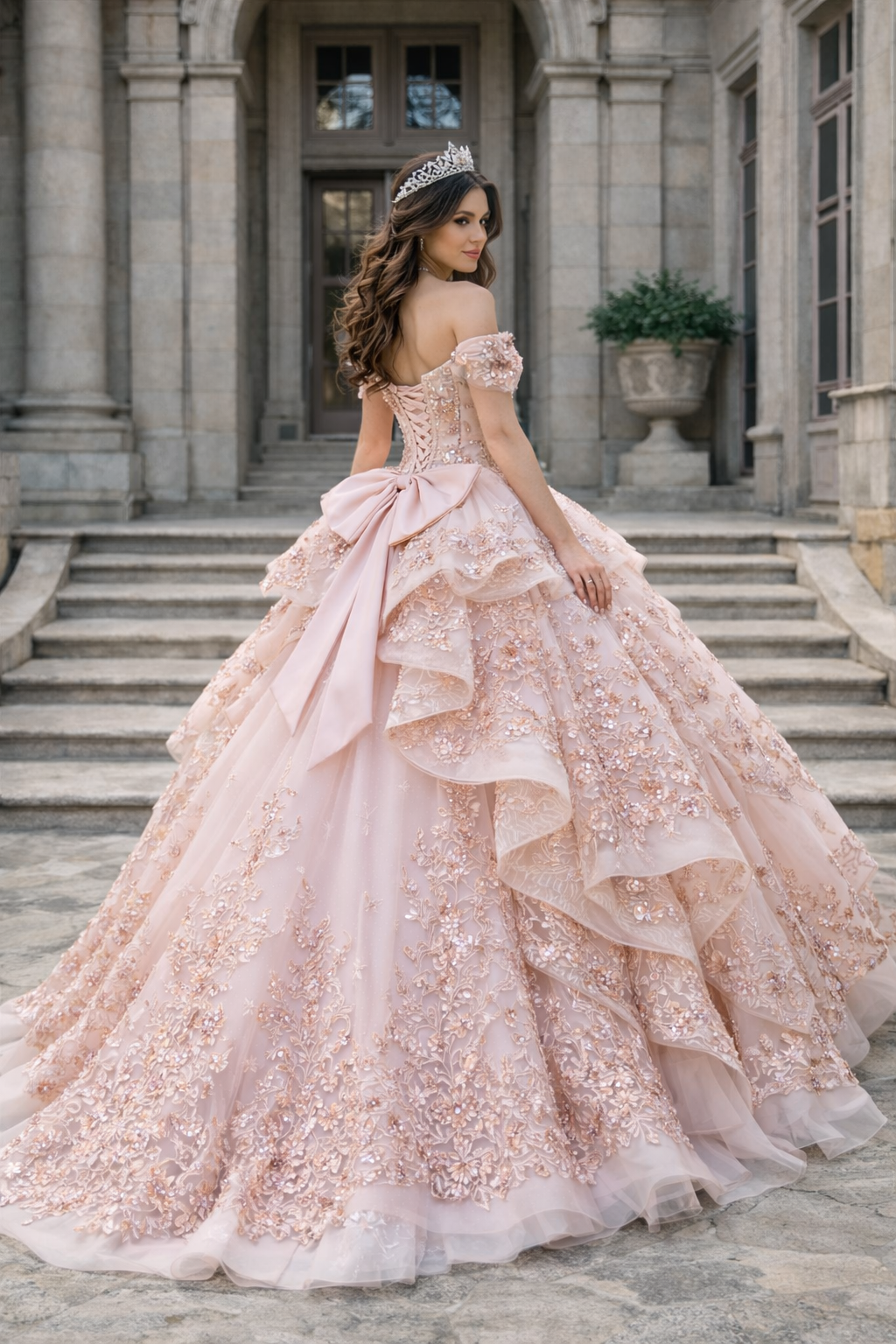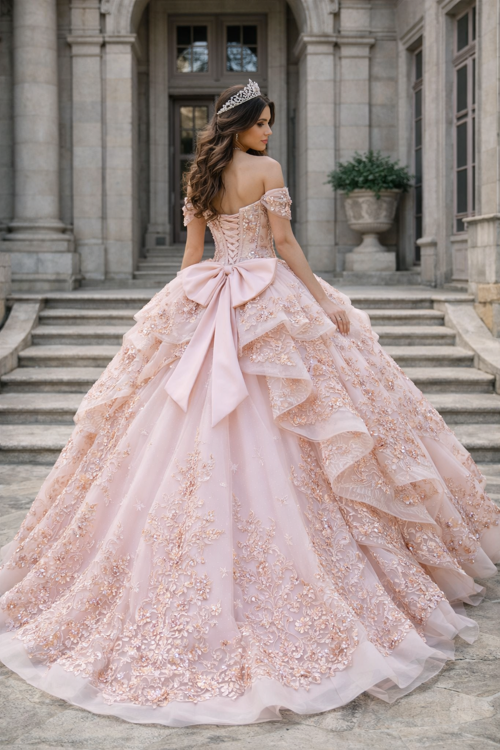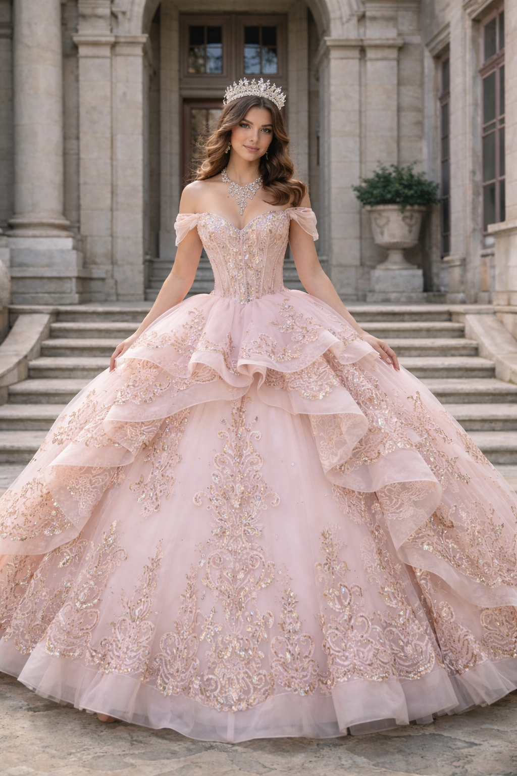 Luxury Blush Pink Tiered Lace Ball Gown Quinceanera Dresses
