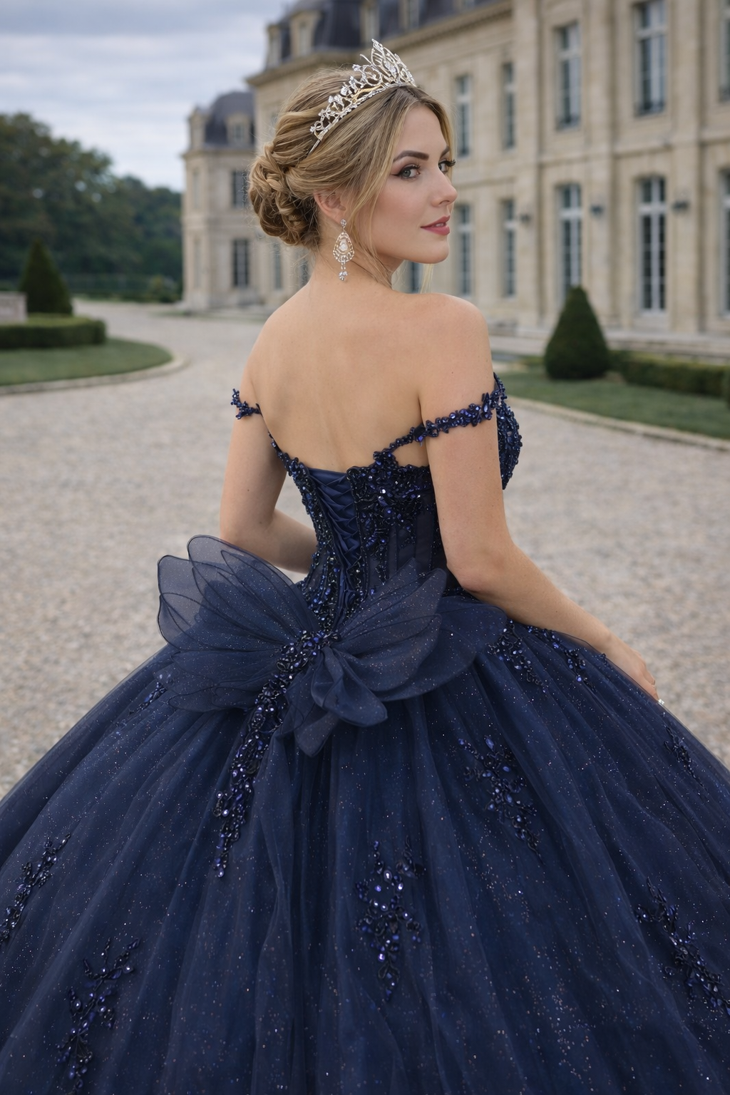 Midnight Navy Glitter Corset Princess Ball Gown with Crystal Bodice & Open Lace-Up Back – Quinceanera Dresses