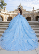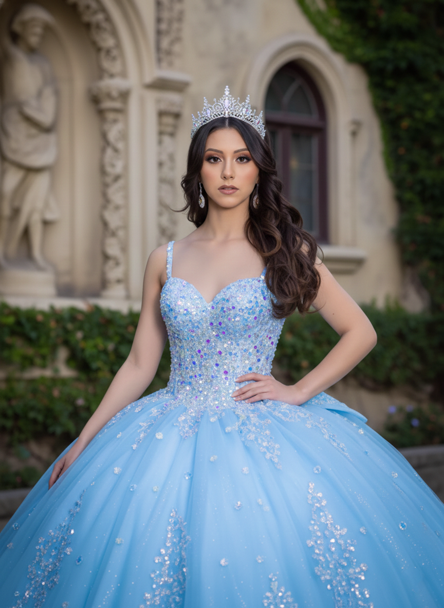 Designed for a grand fairytale entrance, this ice blue quinceañera gown captures timeless elegance with a modern royal touch. The delicately structured bodice shimmers with intricate beading and embroidery, flowing seamlessly into a full glitter tulle skirt that glows with every movement. The voluminous ball gown silhouette creates a dramatic princess effect, while the open lace-up corset back ensures a perfectly sculpted and adjustable fit. A statement piece made for unforgettable celebrations.