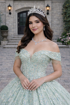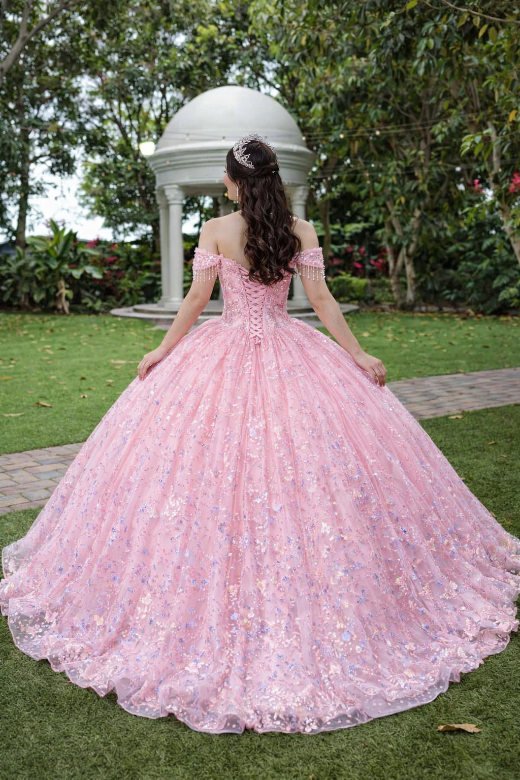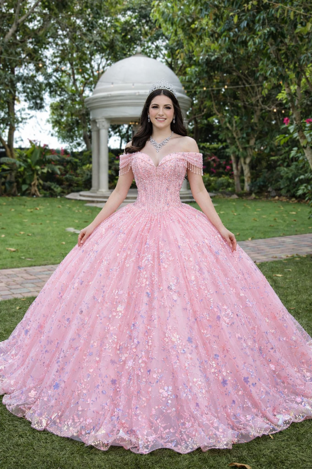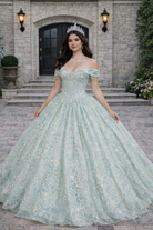 Designed for a royal entrance, this glitter quinceañera ball gown blends timeless princess elegance with modern sparkle. Featuring a structured corset bodice adorned with delicate floral appliqué and shimmering beadwork, the gown flows into a voluminous layered tulle skirt that captures light with every step.