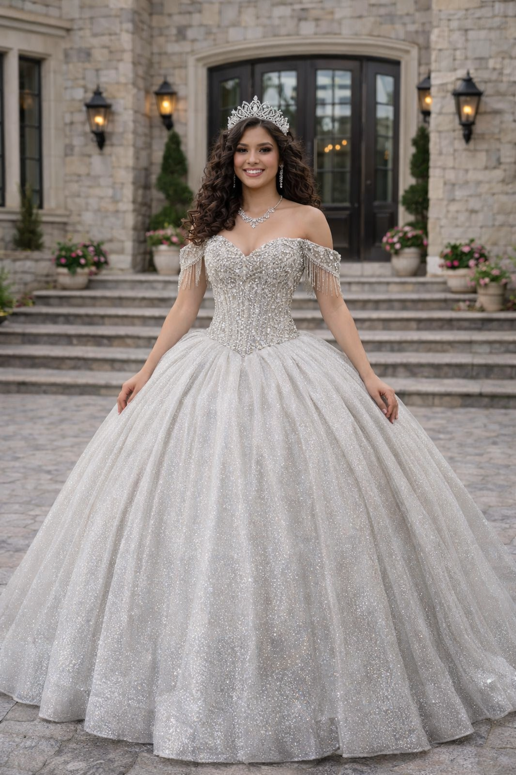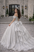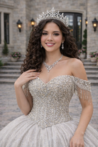 Elegant and luminous, this champagne quinceañera gown embodies refined royal glamour. The off-shoulder sweetheart corset bodice is intricately adorned with delicate beadwork and shimmering embellishments, sculpting the waist with couture structure. The full glitter tulle ball gown skirt flows effortlessly, radiating soft sparkle with every step and creating a timeless princess silhouette.