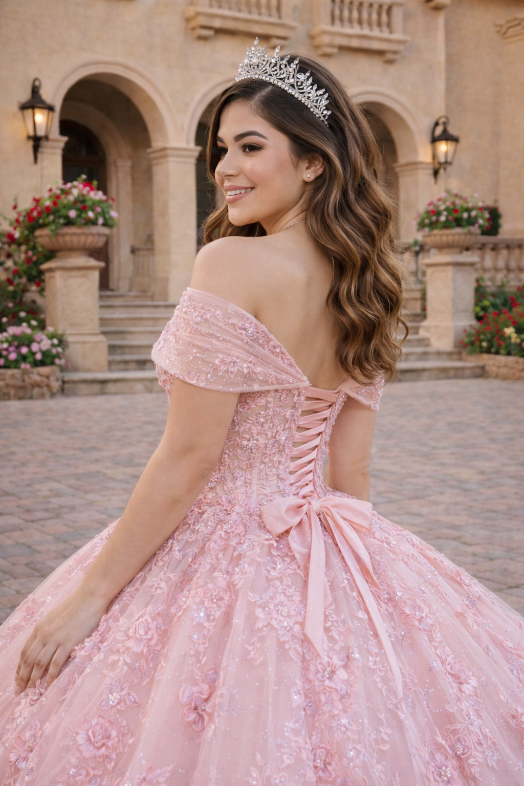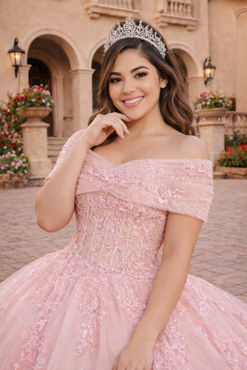 Soft, romantic, and timelessly elegant, this blush quinceañera gown captures the essence of a modern princess. Designed in layered shimmer tulle and adorned with delicate 3D floral appliqués throughout, the structured sweetheart corset bodice sculpts the waist while enhancing your natural silhouette. The full ball gown skirt flows effortlessly with graceful volume, and the open lace-up corset back provides an adjustable, perfectly contoured fit for your most unforgettable celebration.