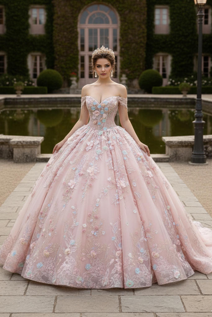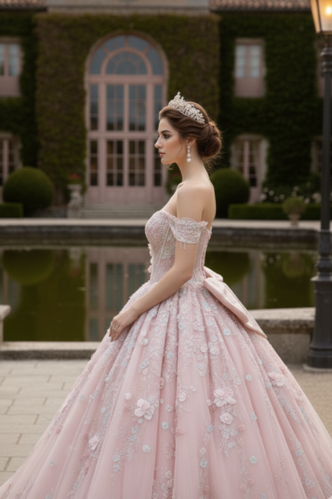 Delicate, dreamy, and effortlessly regal — this blush pink Quinceañera gown captures the beauty of a blooming garden in full elegance. Designed for a grand entrance, it blends soft romance with refined couture craftsmanship.