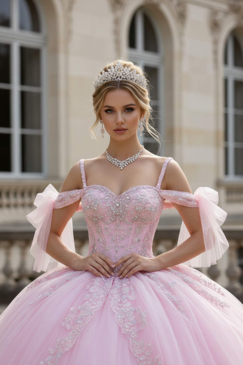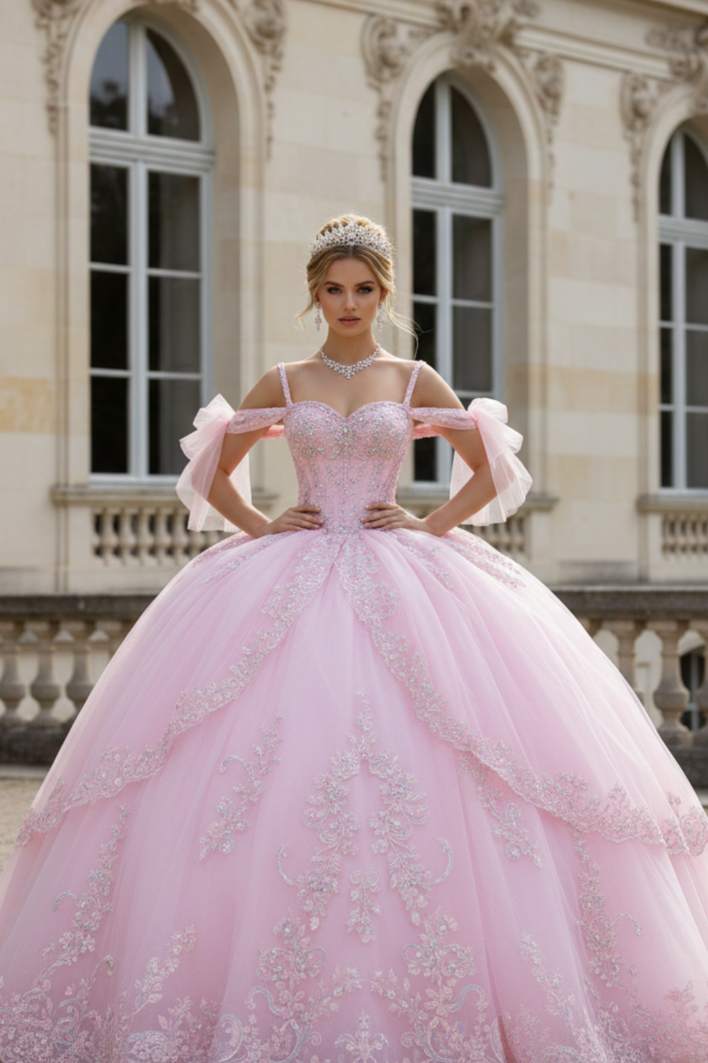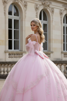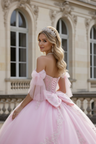 Celebrate your once-in-a-lifetime moment in this breathtaking blush pink Quinceañera gown. Designed with a romantic sweetheart bodice adorned in delicate crystal beading and intricate lace appliqué, this dress radiates soft sparkle and refined elegance. The off-shoulder straps with airy tulle bows add a graceful, feminine touch, perfectly framing the neckline and shoulders.