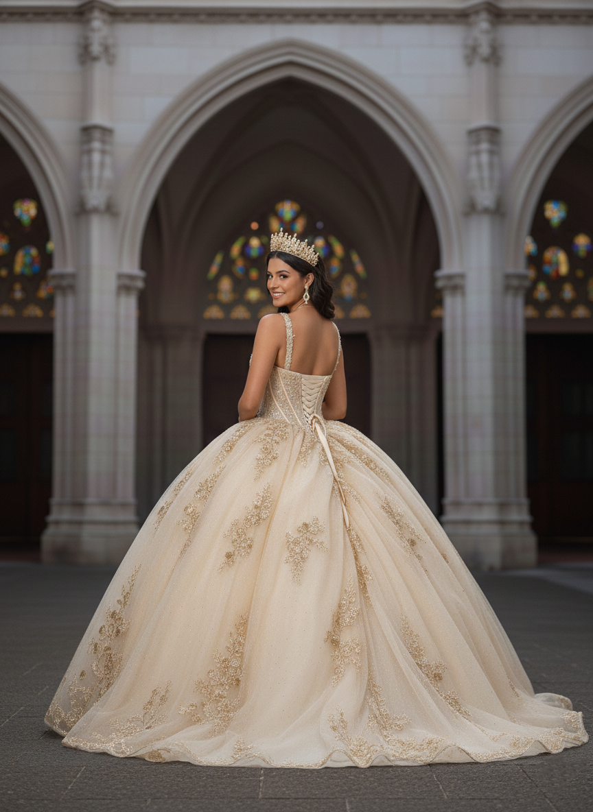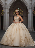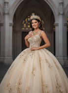 Radiating timeless luxury, this champagne gold quinceañera gown captures the essence of royal elegance. The structured corset bodice features delicate gold embroidery and subtle shimmer, sculpting the waist while enhancing the feminine silhouette.