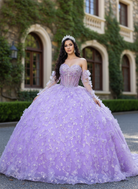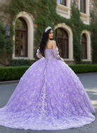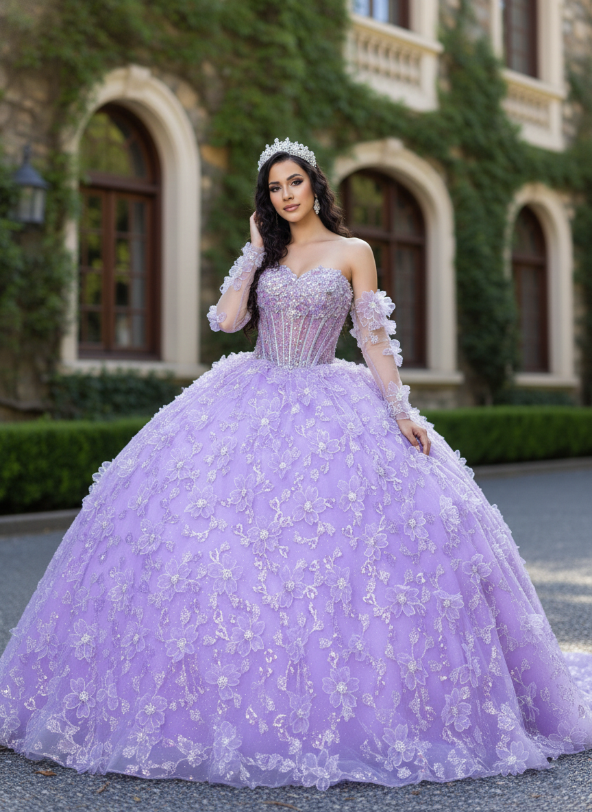 A vision of romance and royal elegance, this lilac princess ball gown captures the magic of a once-in-a-lifetime celebration. The structured sweetheart corset bodice is delicately adorned with shimmering floral lace appliqué, flowing effortlessly into a voluminous layered tulle skirt. Sheer illusion sleeves with soft floral details add a touch of ethereal charm, while the open lace-up back ensures a perfectly adjustable fit. Designed to make your grand entrance unforgettable.