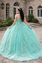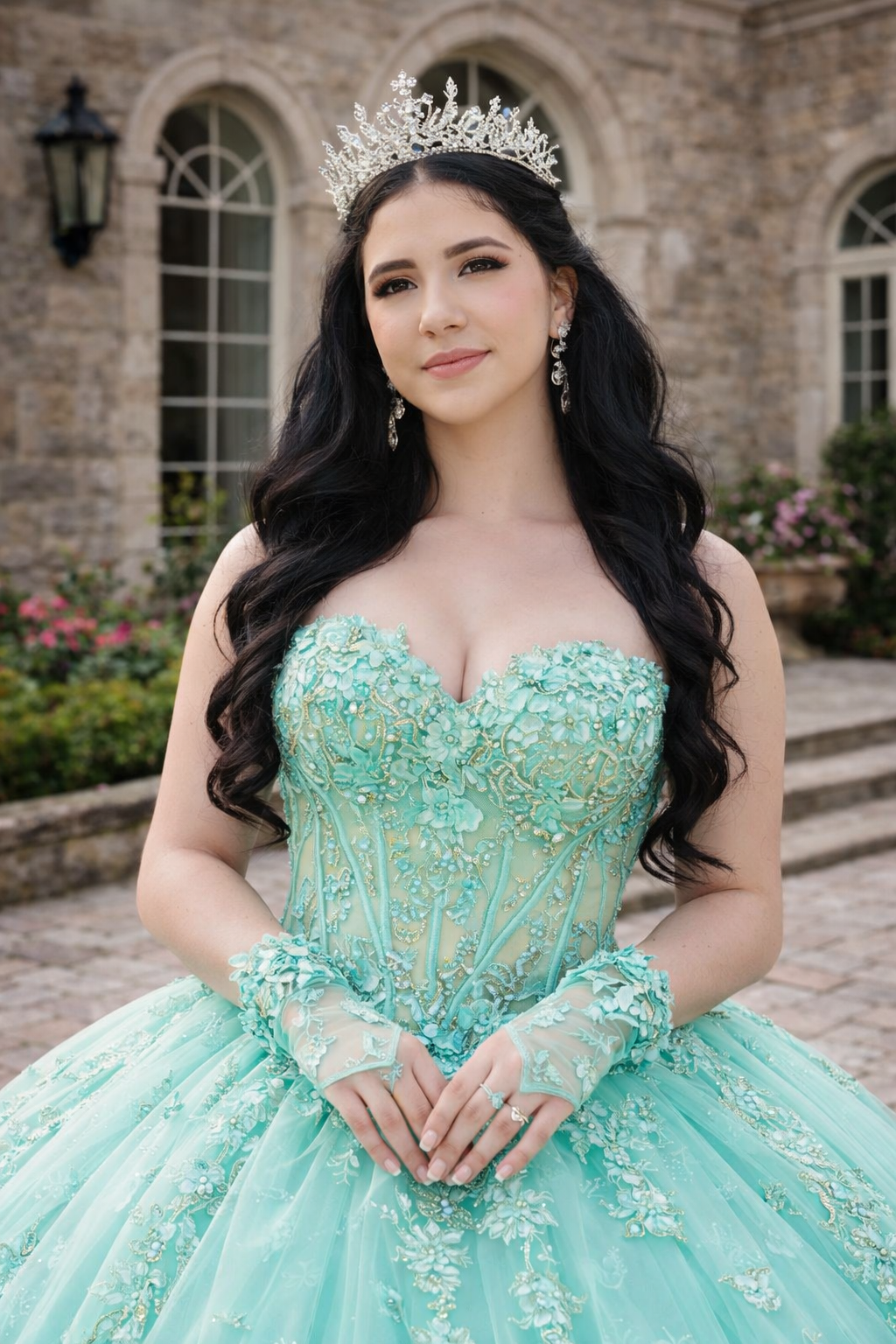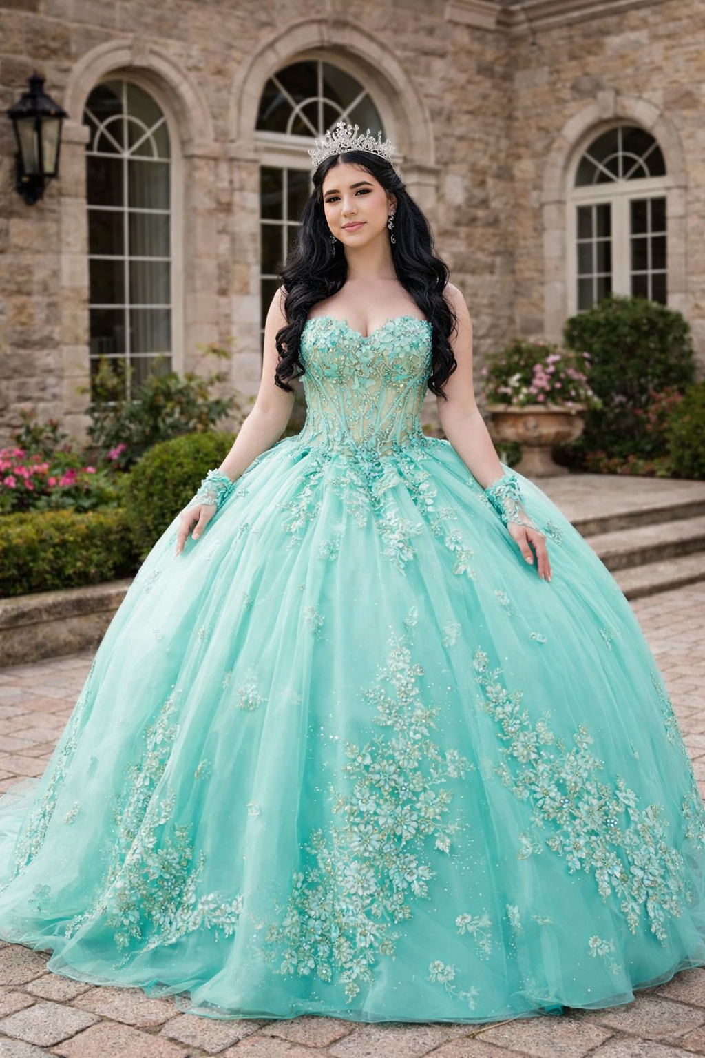 Inspired by timeless royal elegance, this enchanting mint green quinceañera gown captures the essence of a modern fairytale. The structured sweetheart corset bodice is adorned with intricate floral lace appliqué and delicate shimmer, sculpting the waist with refined sophistication. The voluminous glitter tulle skirt flows gracefully into a full princess silhouette, creating breathtaking movement with every step. Finished with an open lace-up corset back, this gown offers both adjustable comfort and a romantic statement detail.• Silhouette: Classic Princess Ball Gown