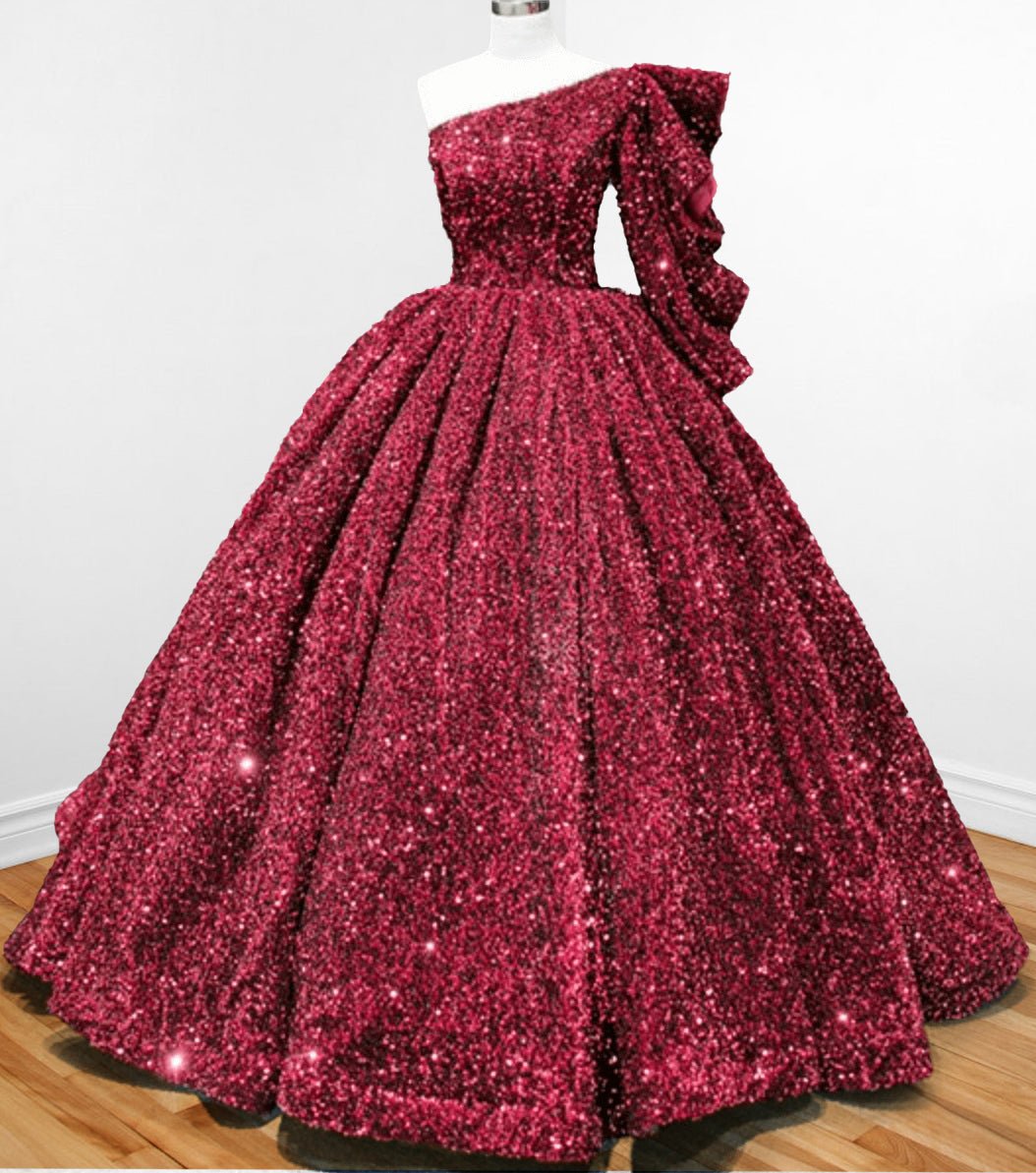 Step into the spotlight with this dazzling Glitter White Sequined One-Shoulder Ball Gown Quinceanera Dress. The shimmering sequin fabric creates a radiant effect, capturing the light with every movement, while the one-shoulder neckline adds a touch of modern elegance to the classic ball gown silhouette. The corset back ensures a perfect, tailored fit, enhancing your figure and providing support throughout your event. The sweeping chapel train lends a regal touch, making your grand entrance even more captivating. It is available in an array of enchanting colors—white, red, burgundy, and sky blue, perfect for any theme or personal style. Be the star of your quinceanera in this exquisite gown that combines timeless charm with contemporary glamour.