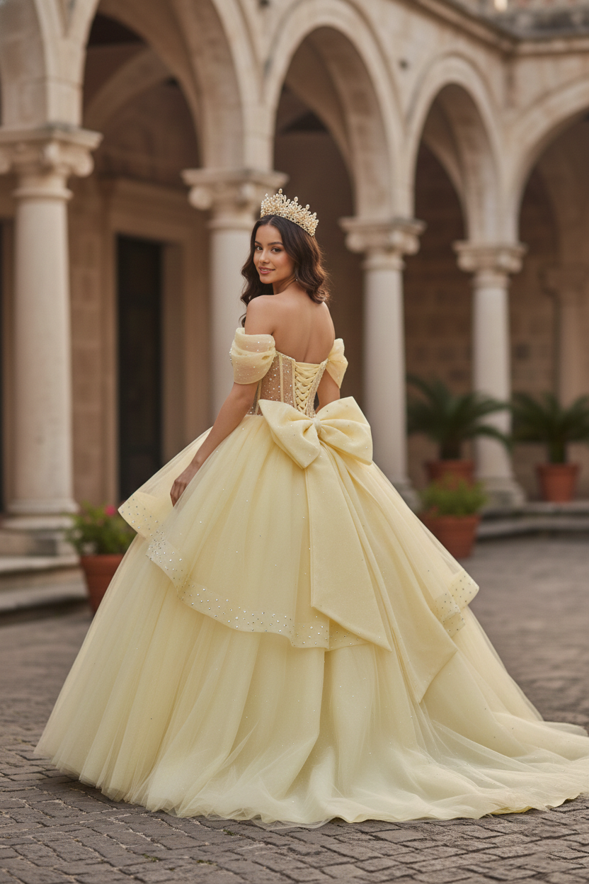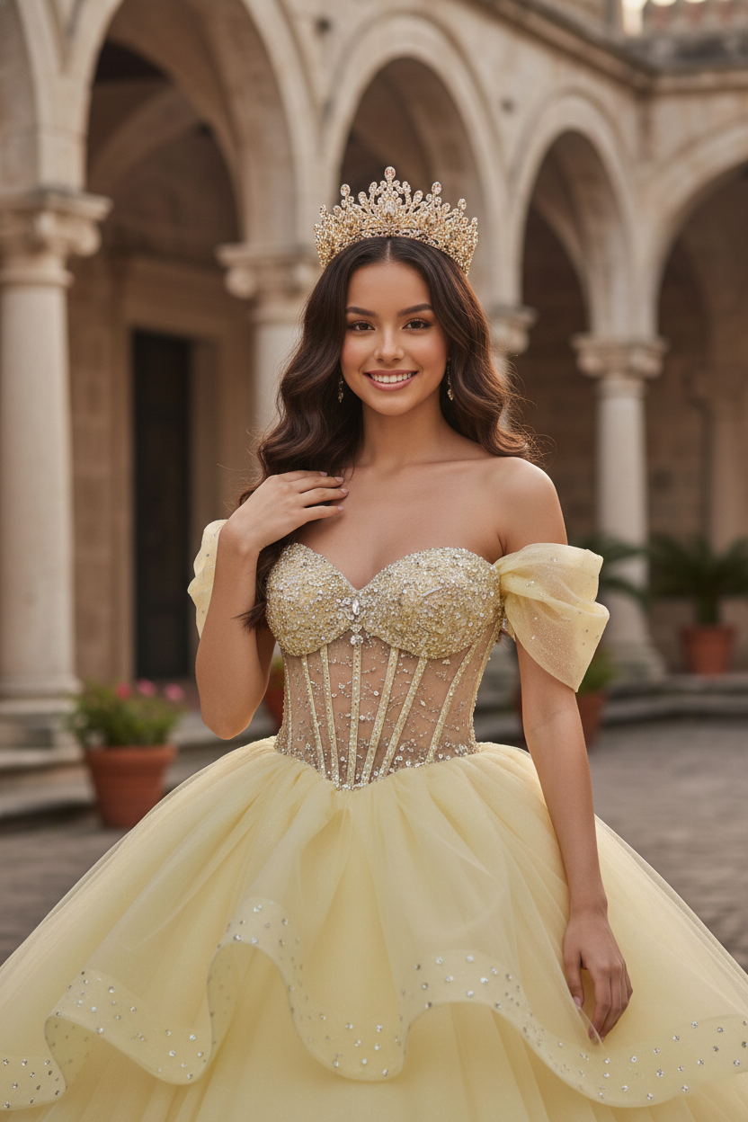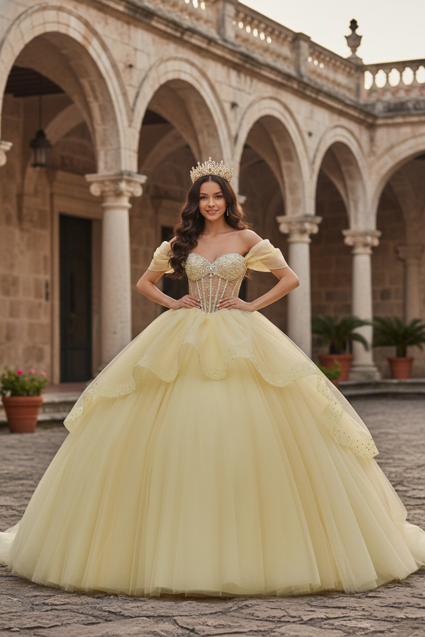 Radiating warmth and royal charm, this golden buttercup quinceañera gown is designed to glow in every light. The structured sweetheart corset bodice is adorned with delicate shimmer detailing, sculpting the waist with elegance and support. Soft off-shoulder tulle sleeves add a romantic touch, while the layered tiered ball gown skirt creates graceful volume and a dreamy princess silhouette.