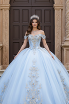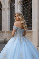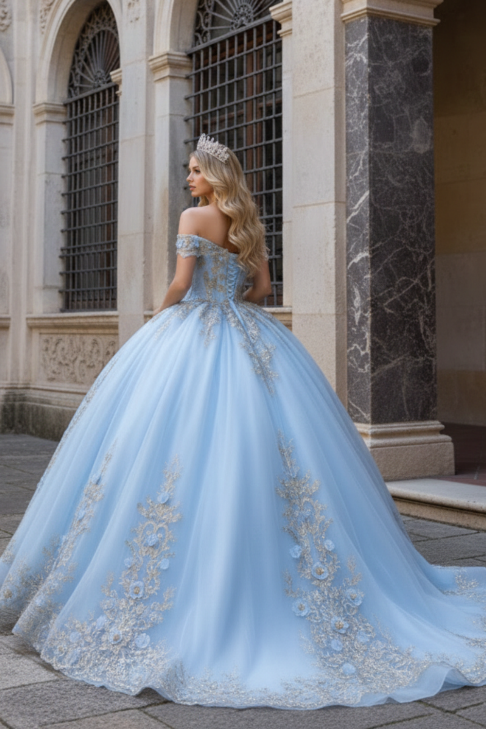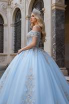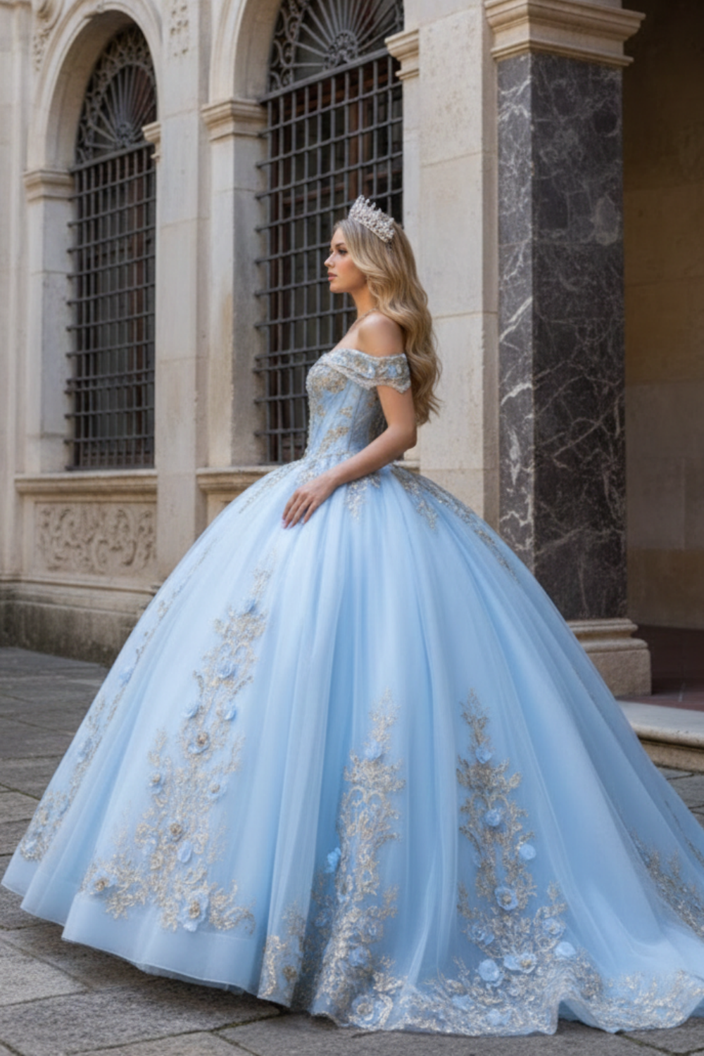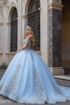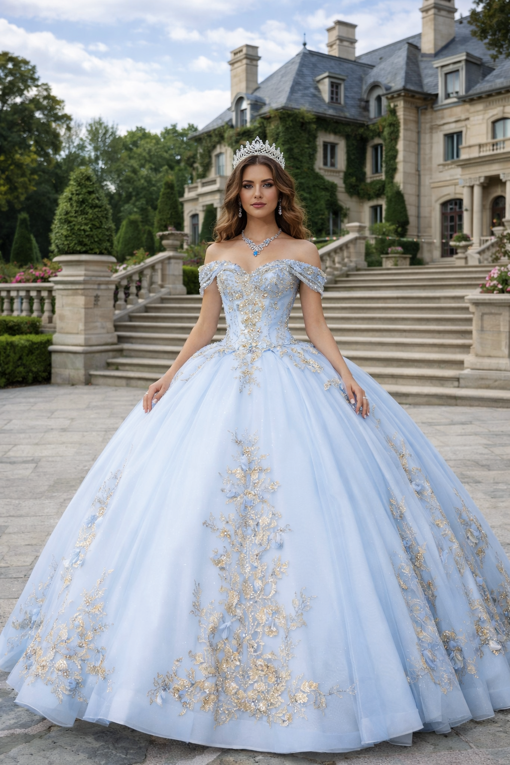 An exquisite vision of elegance, this ice blue Quinceañera gown embodies timeless royalty and refined glamour. The sculpted off-shoulder sweetheart bodice is adorned with intricate gold embroidery and delicate floral appliqués, creating a luminous contrast against the soft blue tulle. Structured corsetry enhances the waistline, offering a beautifully defined silhouette.
