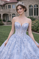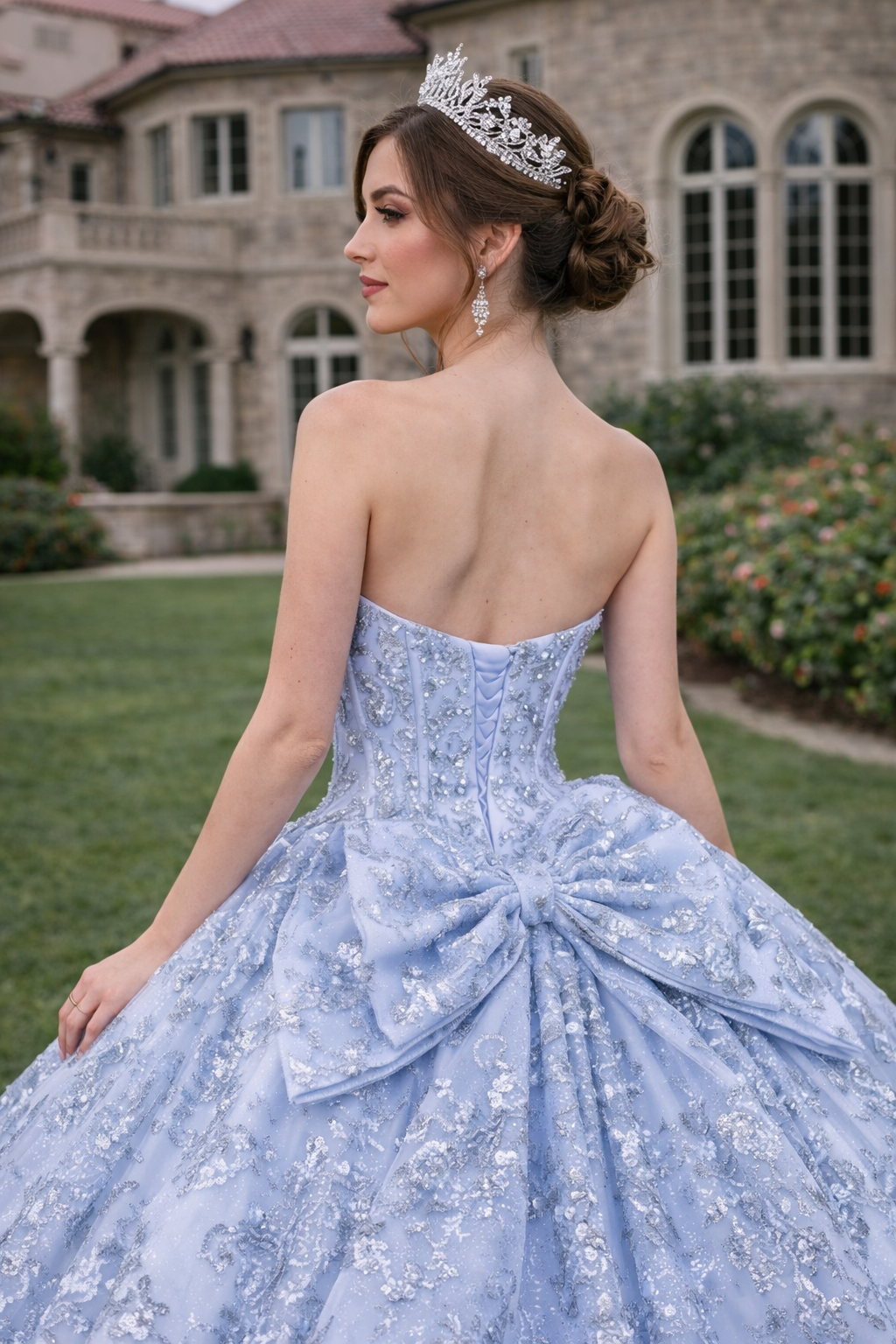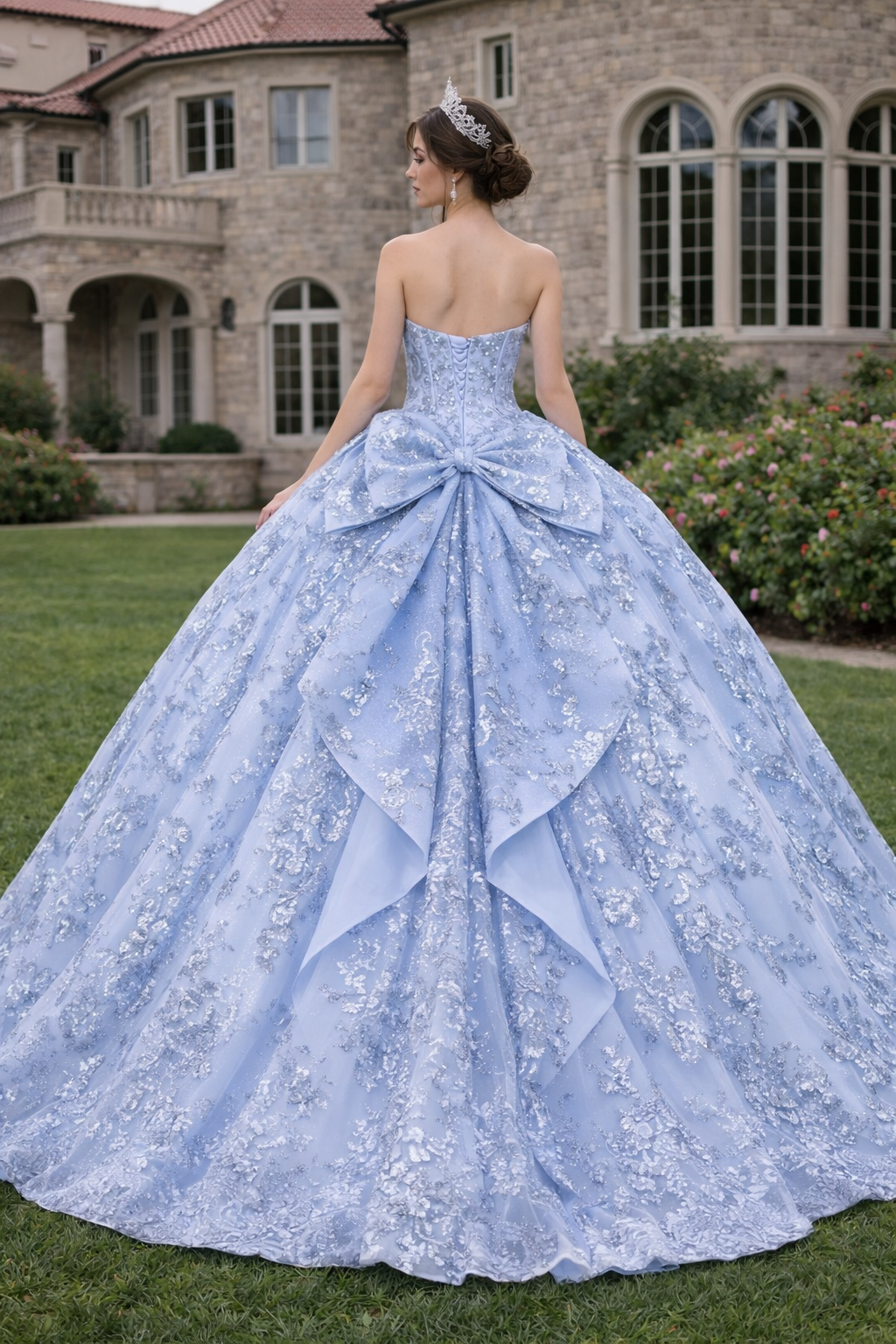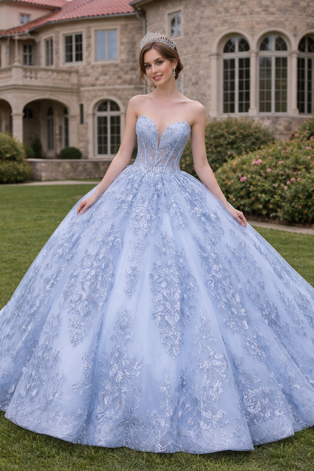 Inspired by timeless royalty, this ice blue quinceañera gown captures elegance in every detail. The structured sweetheart corset bodice features intricate lace embroidery and delicate beadwork that contour the waist with refined sophistication. The voluminous ball gown skirt flows gracefully in layers of soft tulle, adorned with ornate floral patterns that shimmer subtly under the light. An open lace-up back design ensures a customizable fit while adding a romantic, regal finish.