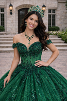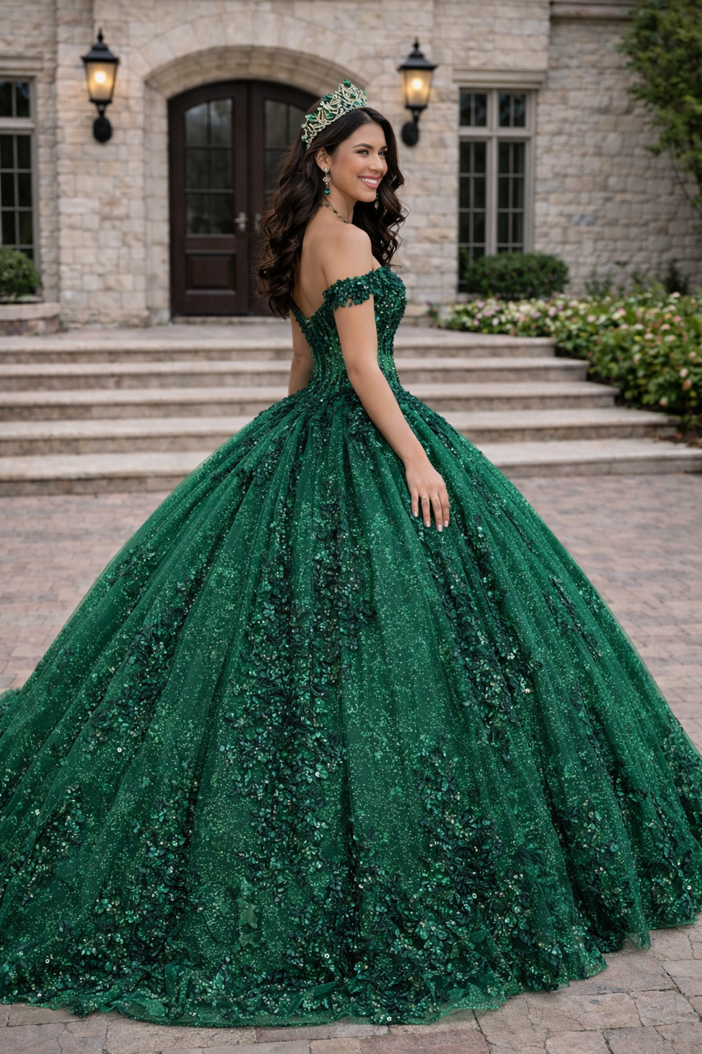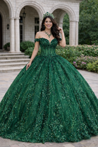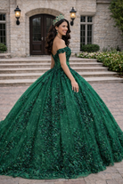Emerald Green Off-Shoulder Glitter Corset Princess Ball Gown Quinceanera Dresses