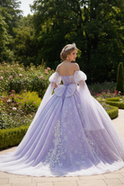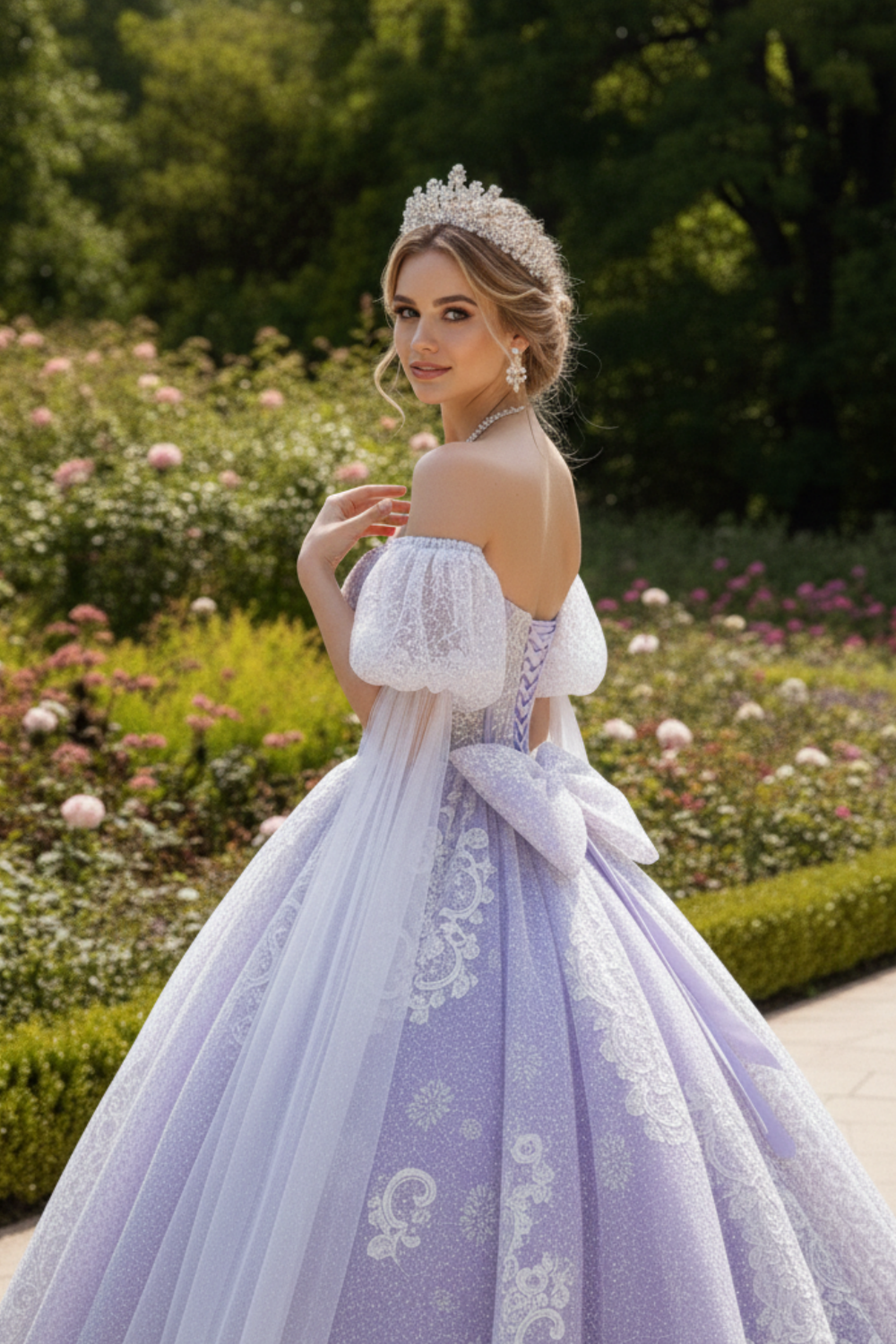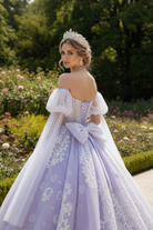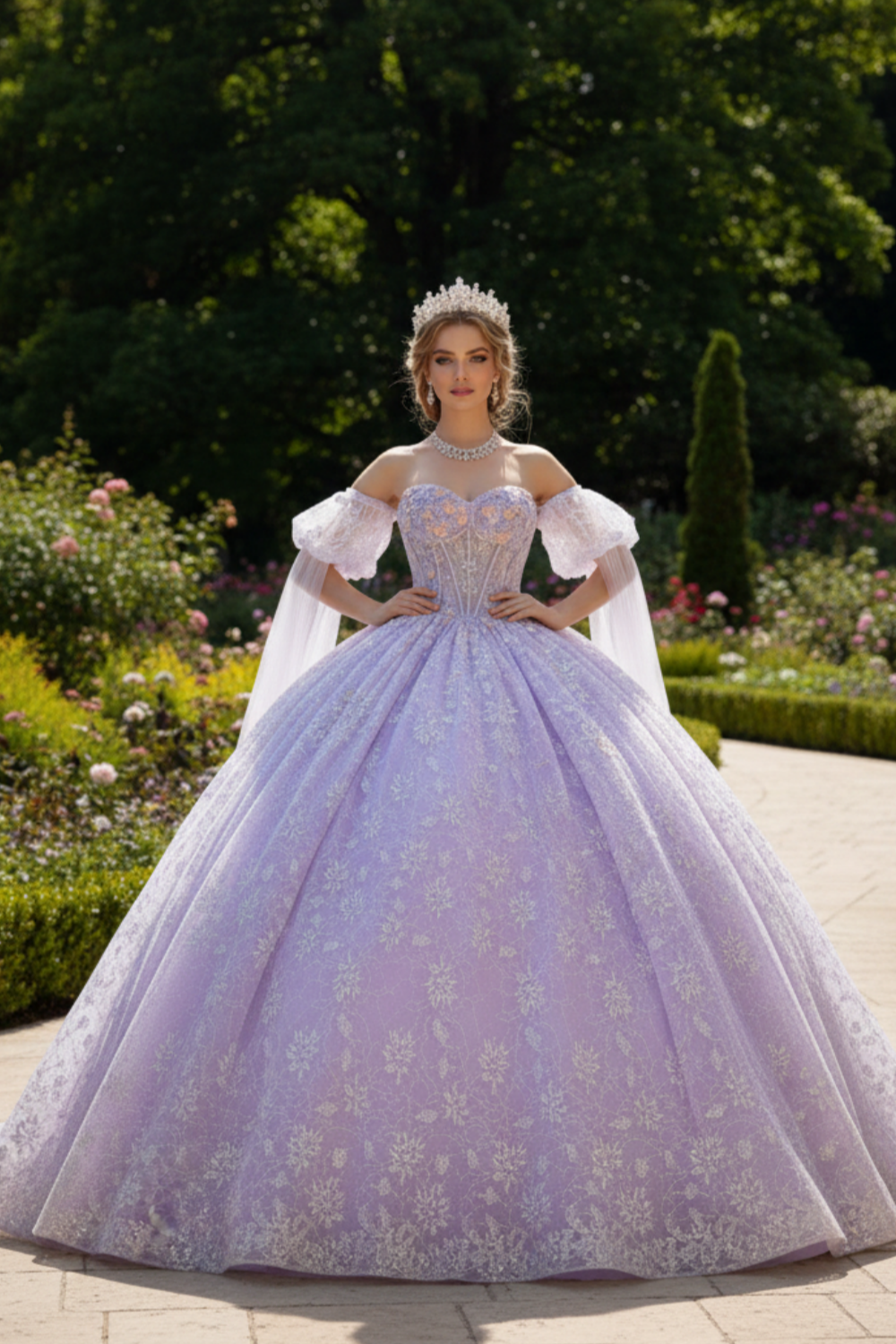 Step into your fairytale moment with this enchanting lavender Quinceañera gown. Designed in a classic princess silhouette, the structured corset bodice features delicate lace embroidery layered over soft tulle, creating a luminous, ethereal finish. The off-shoulder sweetheart neckline is complemented by sheer detachable tulle drapes, adding graceful movement and regal charm.The voluminous floor-length skirt flows effortlessly with intricate lace detailing throughout, giving the gown a soft shimmer under natural light. Finished with an open lace-up corset back, this design offers an adjustable, sculpted fit that enhances the waistline while ensuring comfort and elegance from every angle.