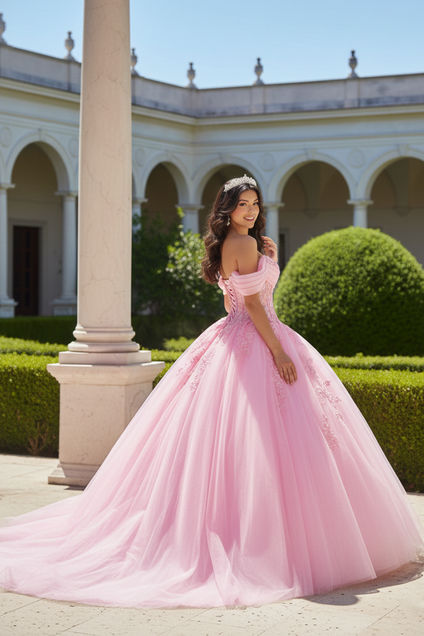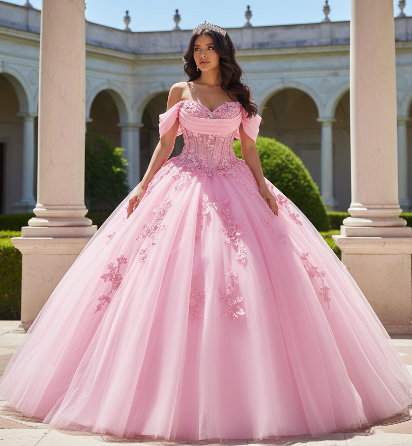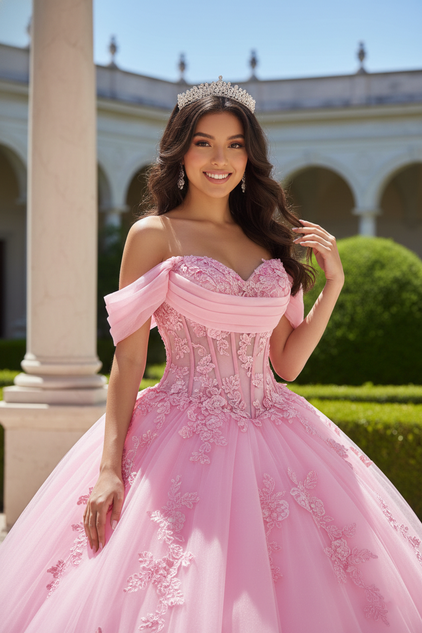 Step into your fairytale moment with this enchanting pink quinceañera ball gown, designed to embody elegance and youthful romance. The structured corset bodice features delicate lace appliqués and soft draped off-shoulder sleeves, gracefully framing the neckline and shoulders. Flowing into a voluminous tulle skirt adorned with intricate floral embroidery, this gown creates a breathtaking princess silhouette. The open lace-up back not only enhances the couture aesthetic but also provides a perfectly adjustable fit for your special day.• Silhouette: Princess Ball Gown