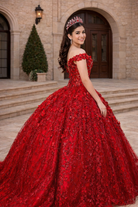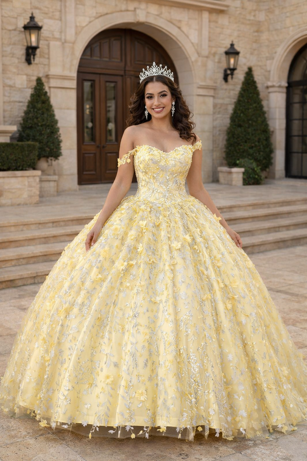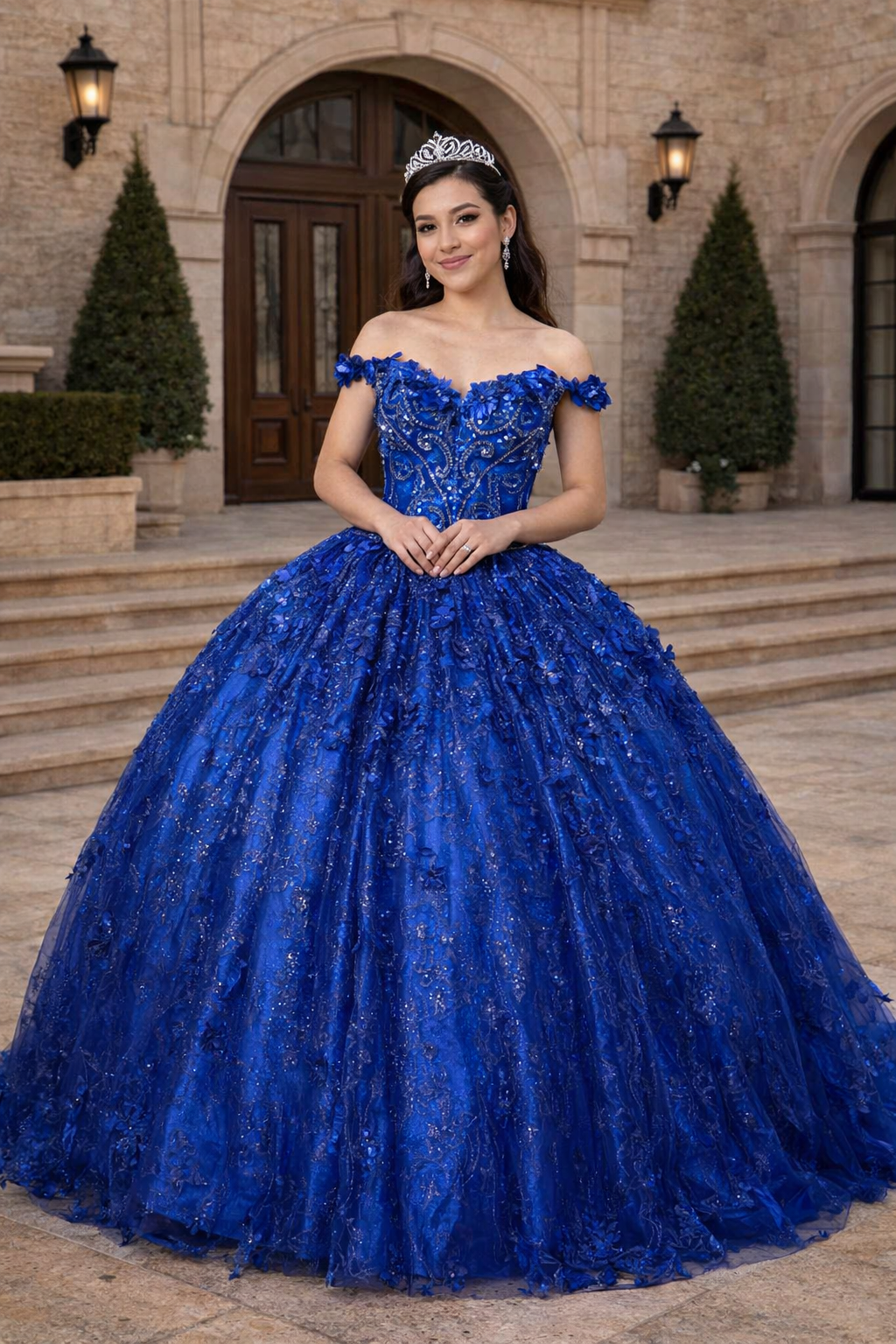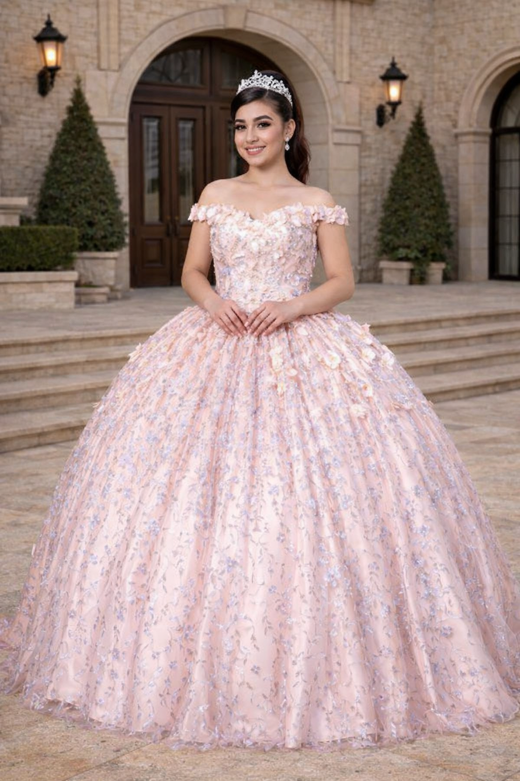 This luxurious Quinceañera gown showcases a timeless princess ball gown silhouette adorned with exquisite 3D floral embroidery and delicate beaded detailing. The elegant off-the-shoulder sweetheart neckline beautifully frames the collarbone, while the structured bodice enhances the waist for a flattering, sculpted fit. Designed with an open lace-up back, it offers adjustable comfort and a perfect customized silhouette, creating a breathtaking look from every angle.