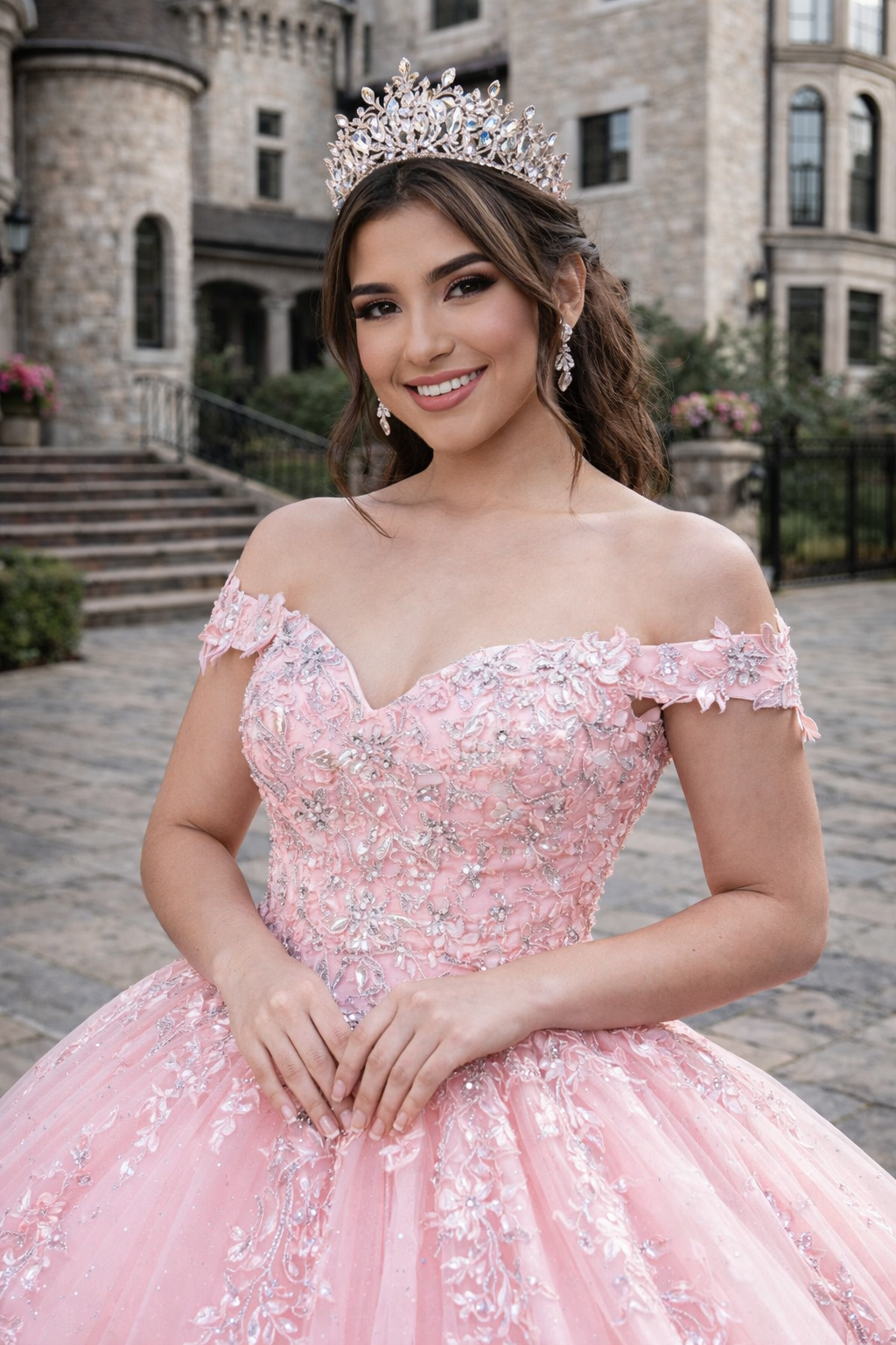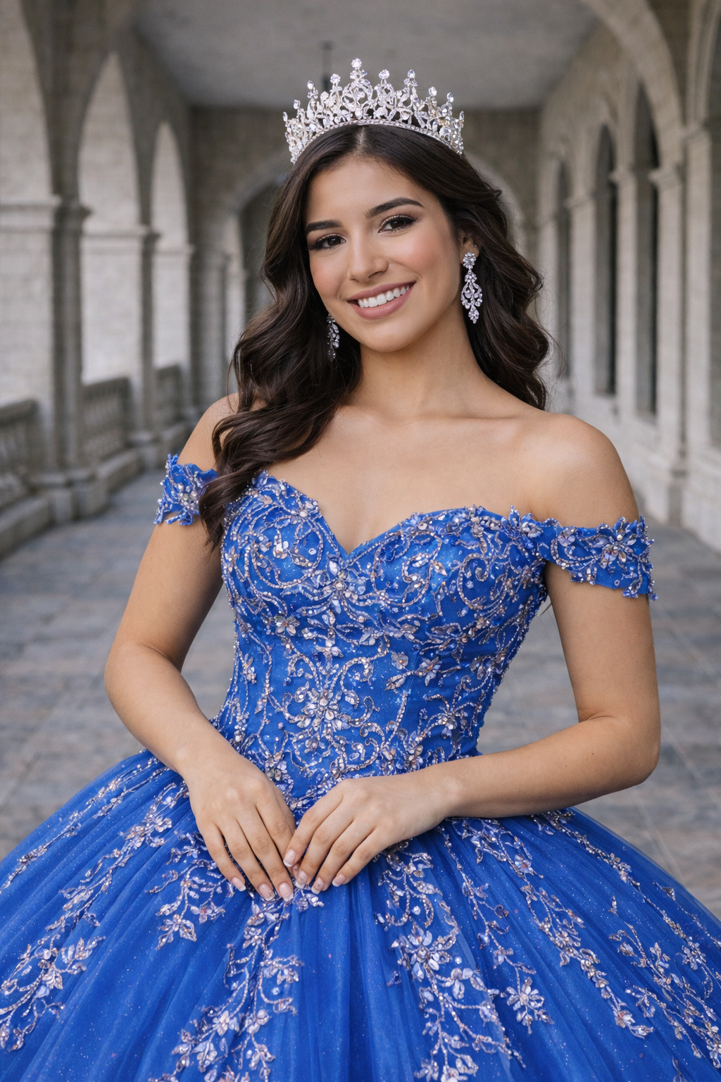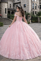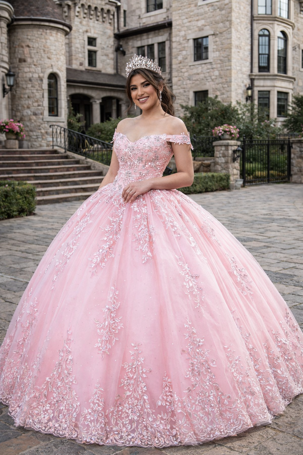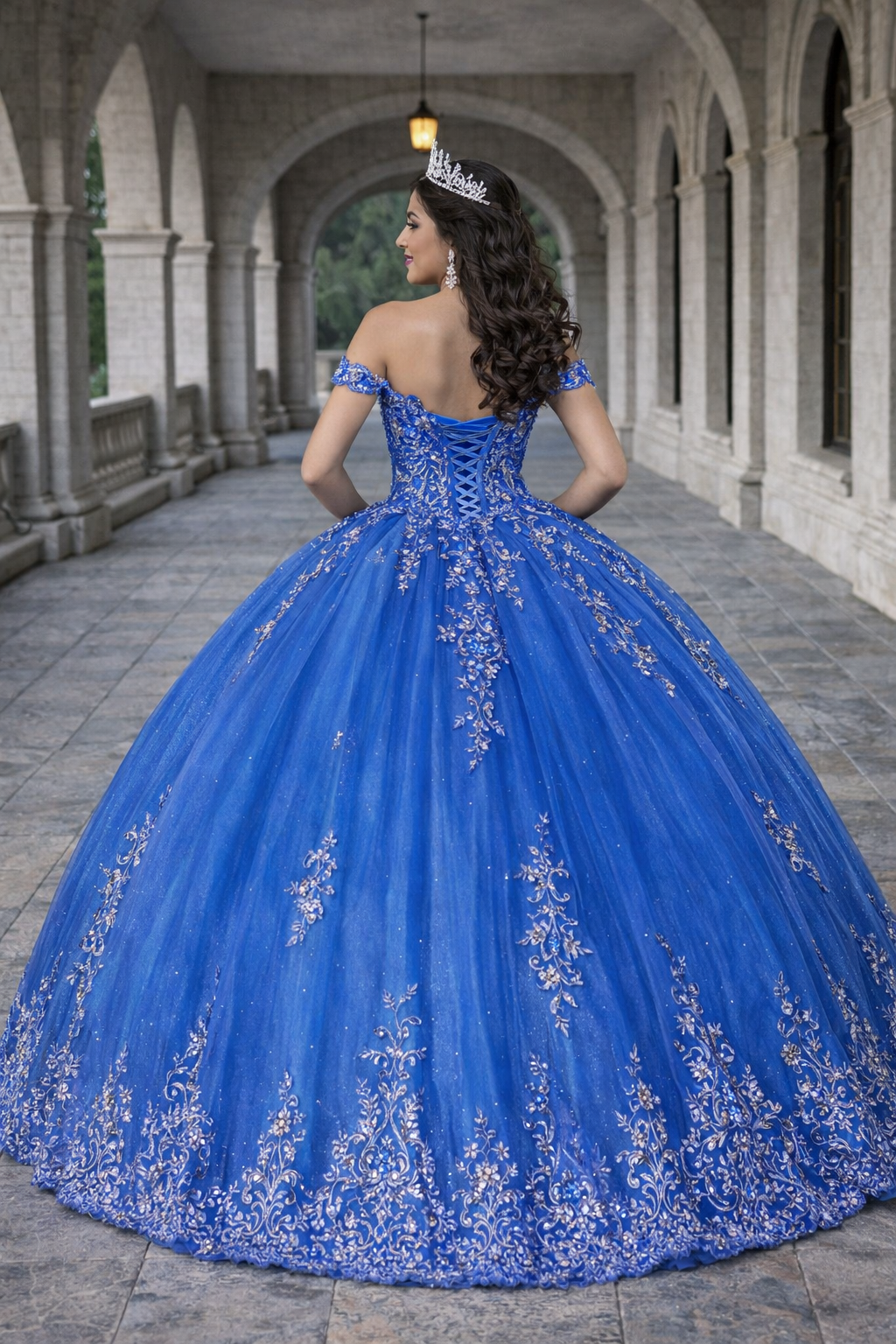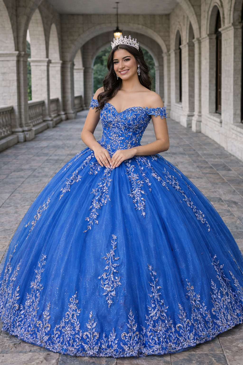 Step into your celebration with regal elegance in this breathtaking princess ball gown. Designed with a romantic off-the-shoulder neckline and a sculpted corset bodice, this gown highlights the waist while offering graceful structure and support. Delicate embroidered lace appliqués cascade across the glitter tulle skirt, creating dimension, shimmer, and timeless sophistication. The dramatic full skirt flows beautifully with every step, making it perfect for a grand entrance. Finished with an open lace-up corset back, it ensures a customizable fit and a stunning silhouette from every angle.• Silhouette: Classic Princess Ball Gown