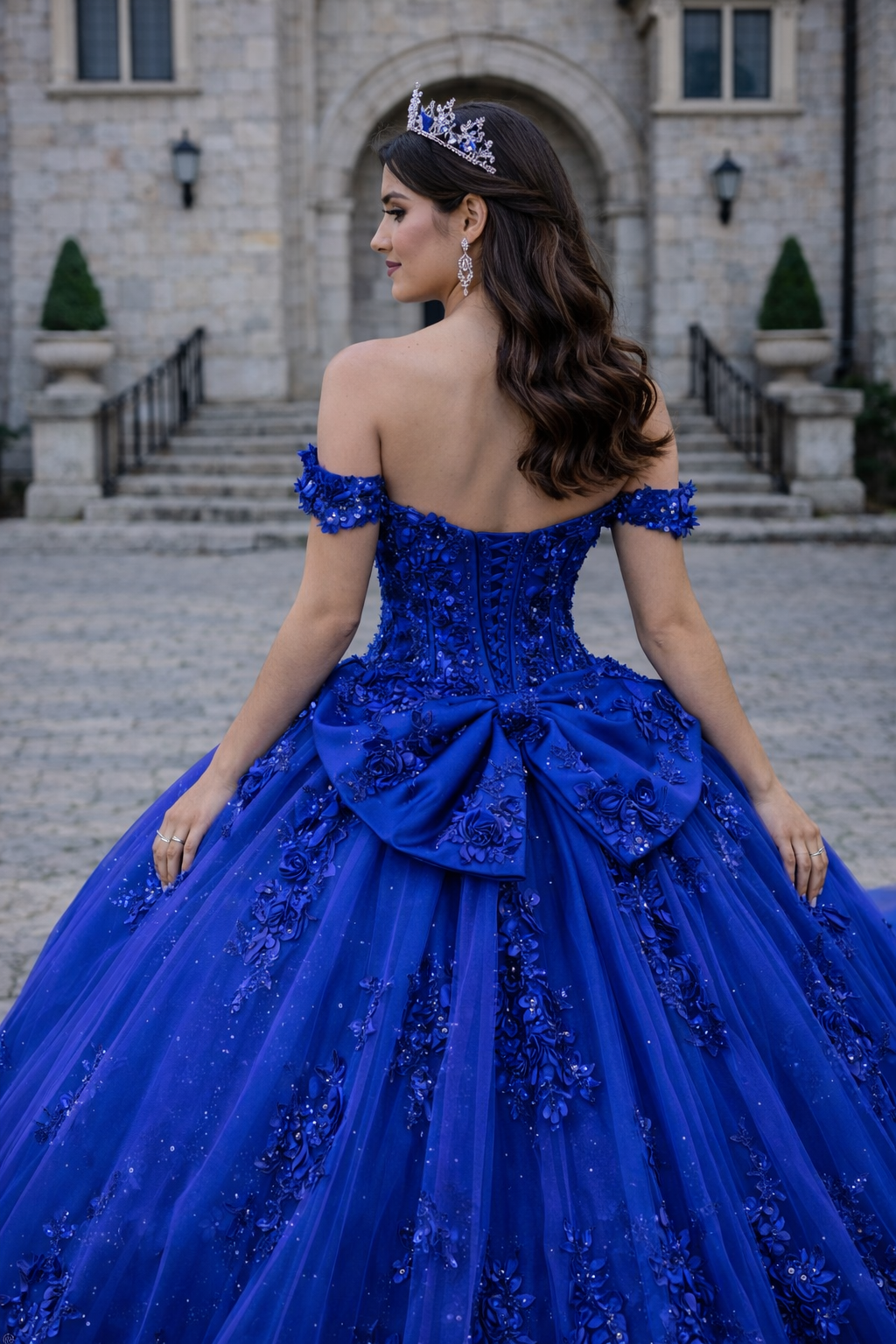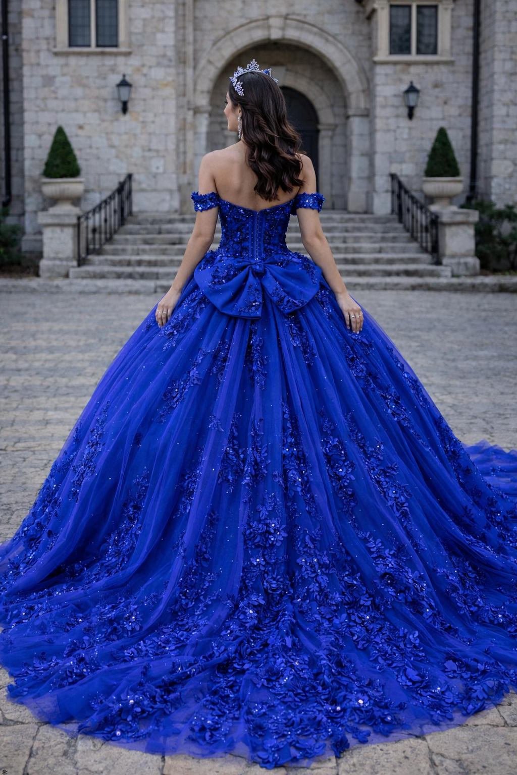 Crafted in a rich sapphire-blue hue, this gown radiates regal elegance and modern couture sophistication. The off-the-shoulder sweetheart corset bodice features intricate 3D floral appliqué and delicate embellishments that sculpt the waist and enhance natural curves. Structured boning provides refined shaping and secure support while maintaining a graceful silhouette.