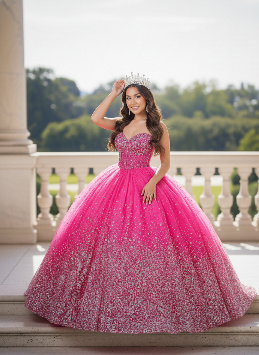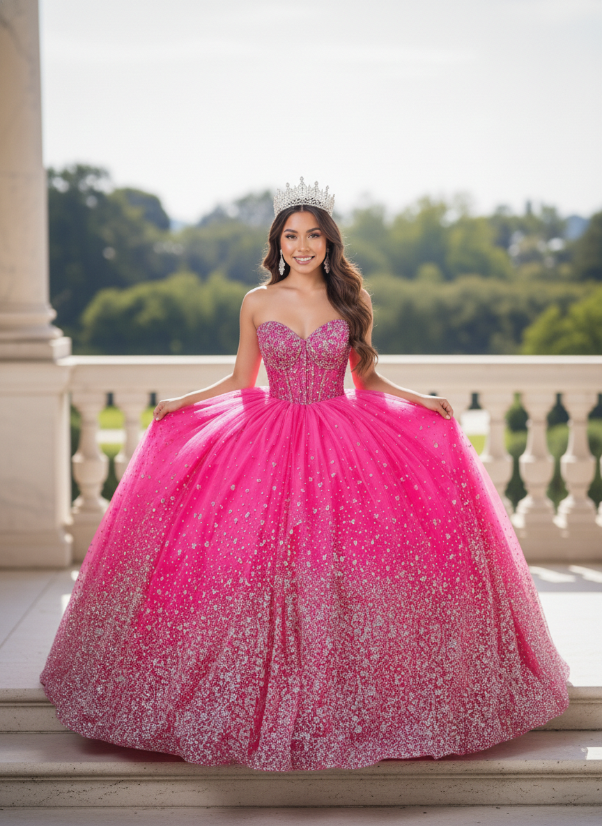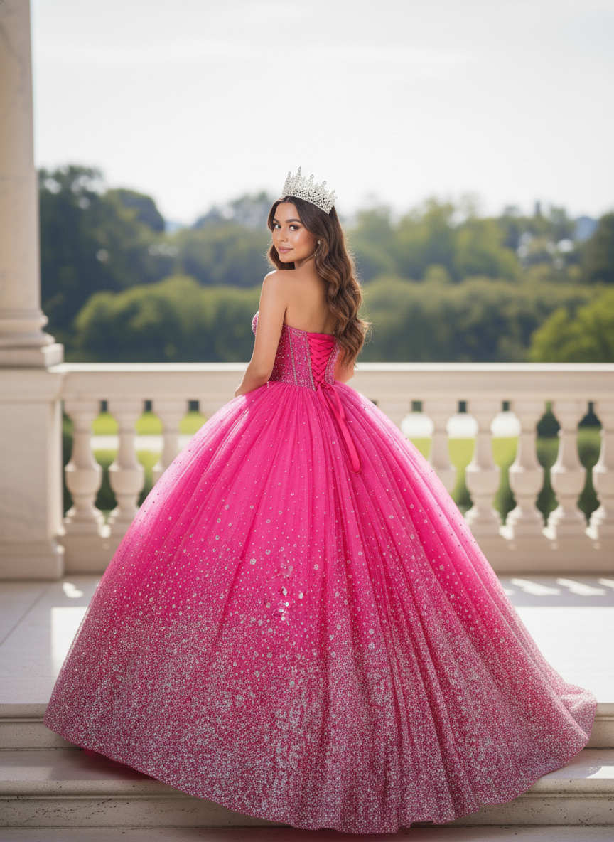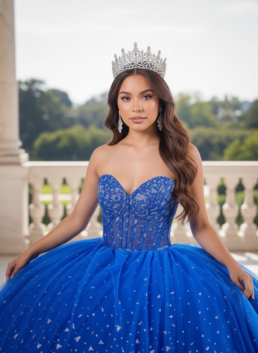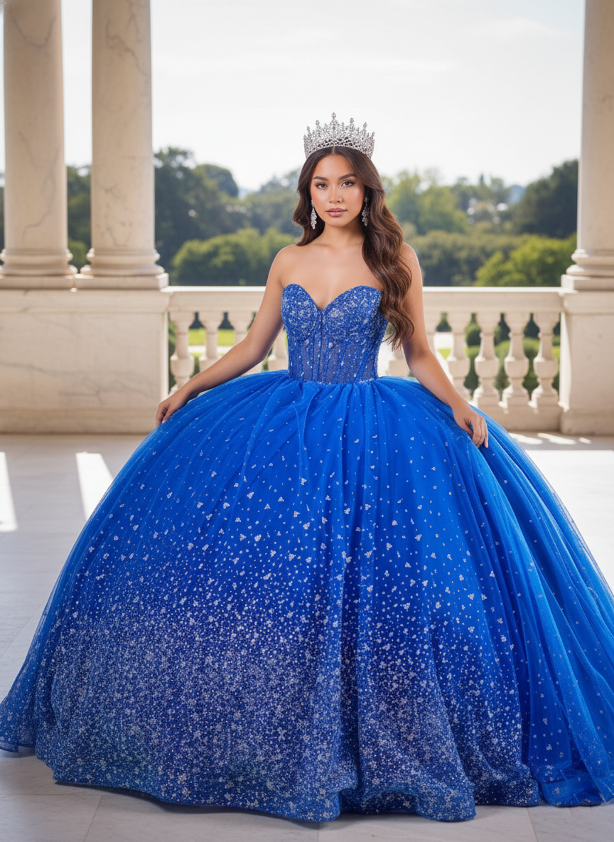 Make a grand and unforgettable entrance in this dazzling Quinceañera ball gown, available in Royal Blue and Hot Pink. The structured sweetheart corset bodice is richly adorned with shimmering embellishments, sculpting the waist with refined precision. The voluminous glitter tulle skirt features a radiant gradient sparkle effect that catches the light from every angle. Finished with an open lace-up back, this gown offers an adjustable, contoured fit that blends comfort with couture elegance — perfect for a celebration worthy of royalty.