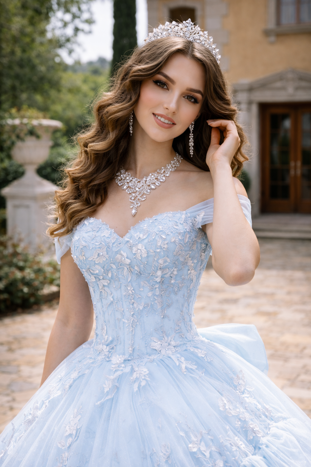 Embrace timeless elegance in this dreamy sky blue Quinceañera gown, designed to capture the magic of your most unforgettable celebration. The romantic sweetheart neckline with soft off-the-shoulder straps highlights the collarbone, while the structured corset bodice is adorned with delicate lace appliqué and subtle shimmer for a refined glow.