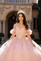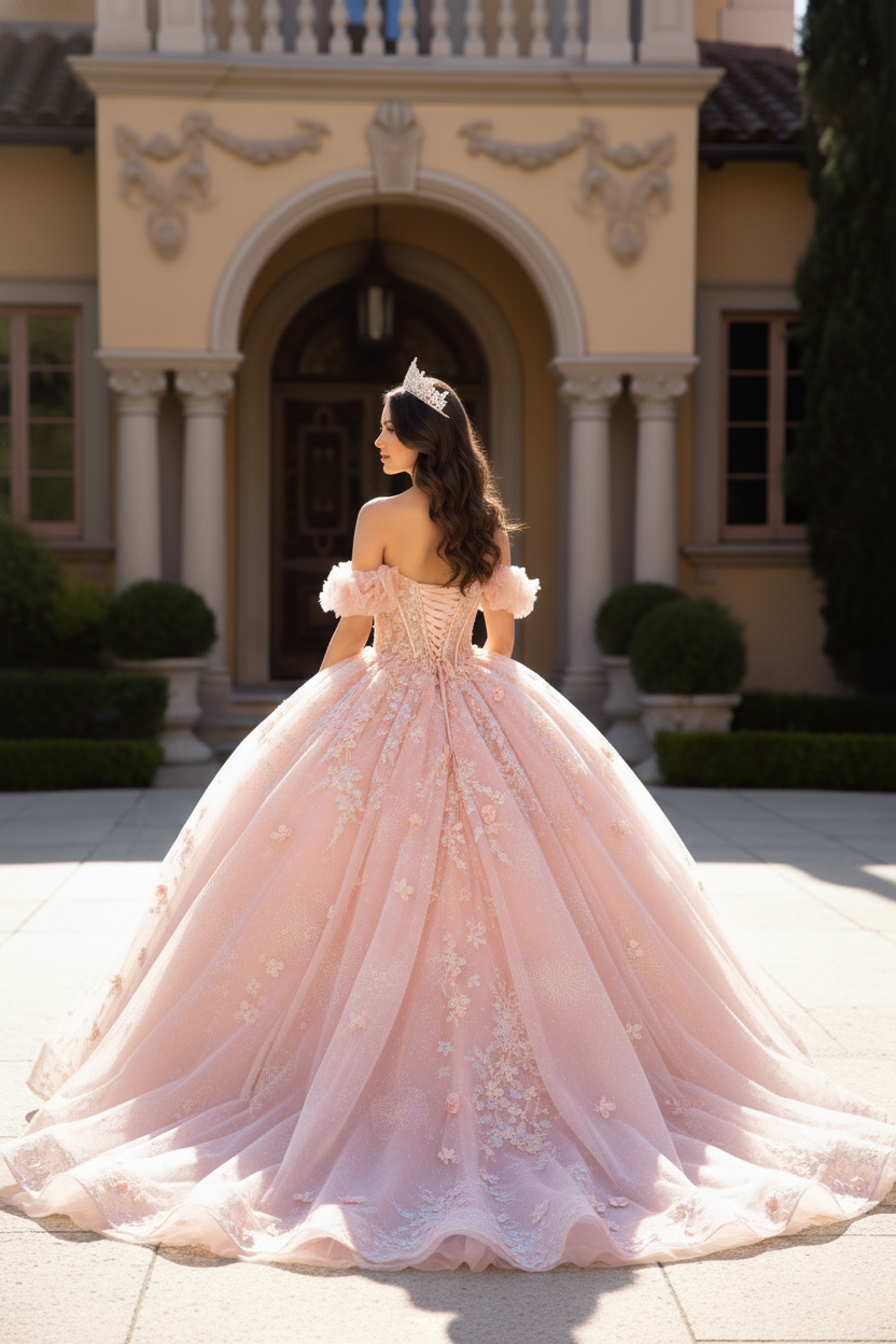 Radiating soft sophistication and timeless romance, this blush peach Quinceañera gown is designed to captivate with effortless elegance. The structured sweetheart corset bodice features intricate floral embroidery that sculpts and defines the waist, while delicate off-the-shoulder tulle sleeves add a graceful, ethereal touch. The voluminous layered skirt blooms into a classic princess silhouette adorned with refined floral detailing. Finished with an open lace-up back, this gown offers an adjustable, contoured fit that blends comfort with couture-level refinement.