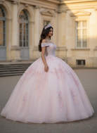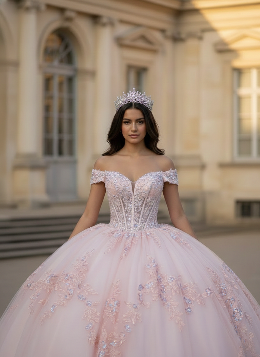 Celebrate your milestone in ethereal elegance with this blush pink quinceañera ball gown. Designed with a sculpted corset bodice and delicate off-shoulder neckline, the gown is adorned with intricate lace appliqués and subtle shimmering embellishments that catch the light with every movement. The voluminous layered tulle skirt creates a grand princess silhouette, while the open lace-up back ensures both dramatic detail and a perfectly adjustable fit for your unforgettable entrance.