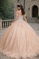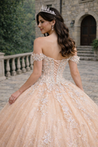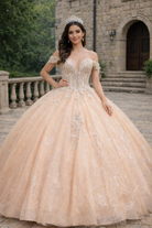 Champagne Gold Off-Shoulder Princess Corset Ball Gown with Glitter Lace Appliqué Quinceanera Dresses