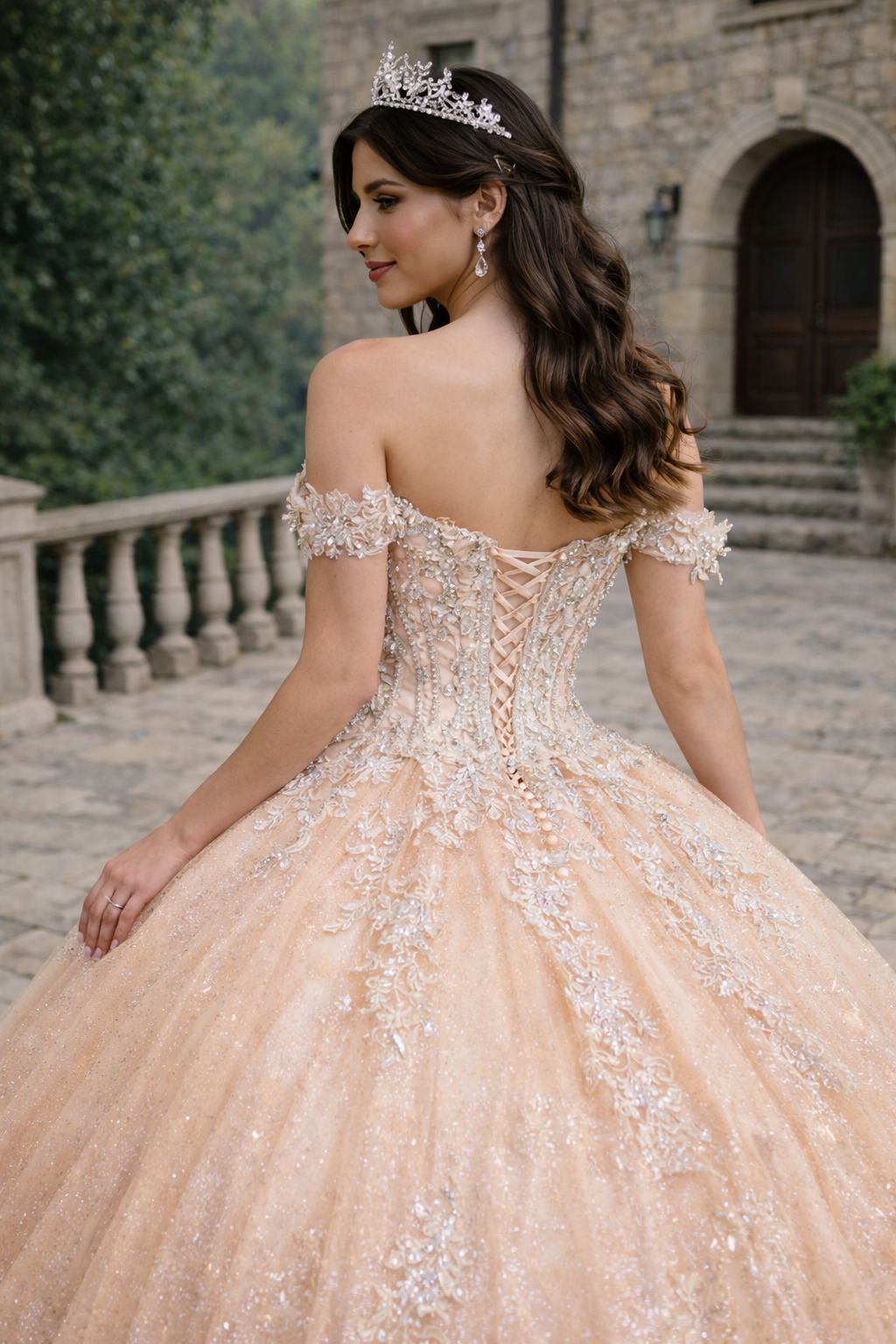 Crafted in a luminous champagne-gold hue, the off-the-shoulder sweetheart corset bodice features intricate lace appliqué and delicate embellishments that sculpt the waist while enhancing natural curves. The subtle illusion detailing adds modern sophistication while maintaining classic princess charm.