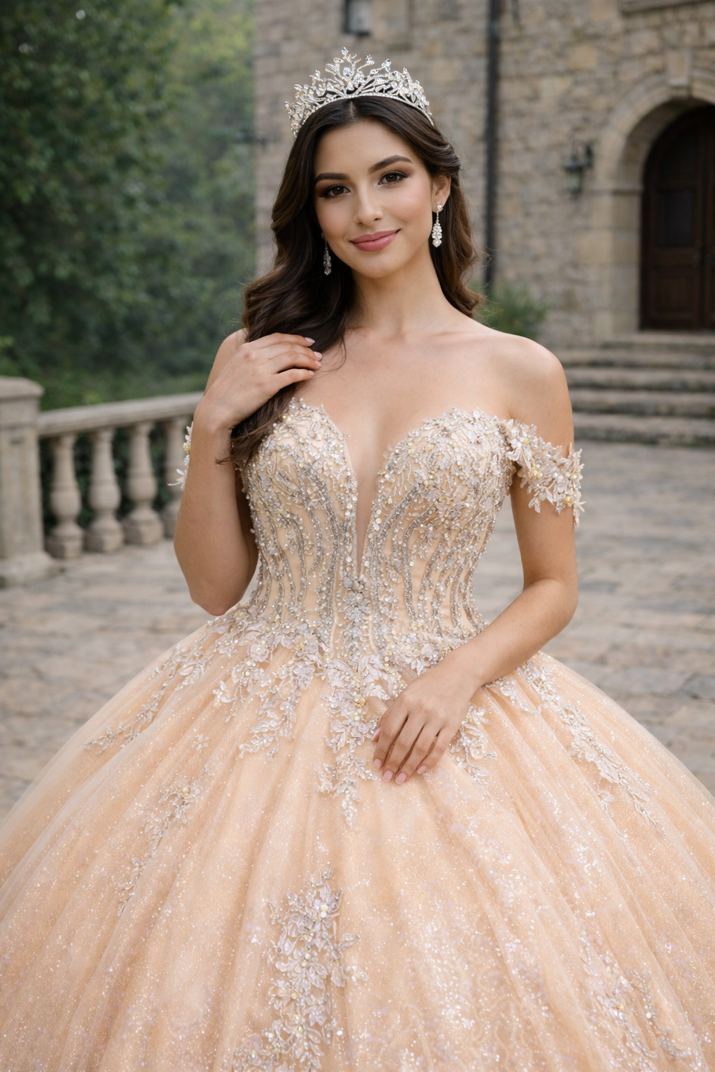 The dramatic full ball gown skirt flows into breathtaking ballroom volume, layered with premium glitter-infused tulle that catches the light with a soft, refined shimmer. Dimensional floral embroidery cascades throughout the gown, adding texture, depth, and couture elegance.
