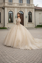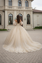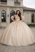 A vision of regal elegance, this champagne gold ball gown is designed to illuminate your grand celebration. The structured sweetheart bodice is richly adorned with intricate gold embroidery and delicate beadwork, sculpting the waist before flowing into a voluminous glitter tulle skirt. Sheer long puff sleeves add a romantic, royal touch, while the open lace-up corset back ensures a perfectly adjustable fit for a flawless silhouette.