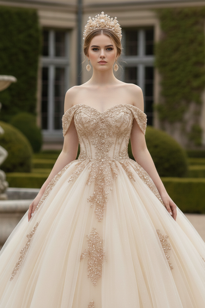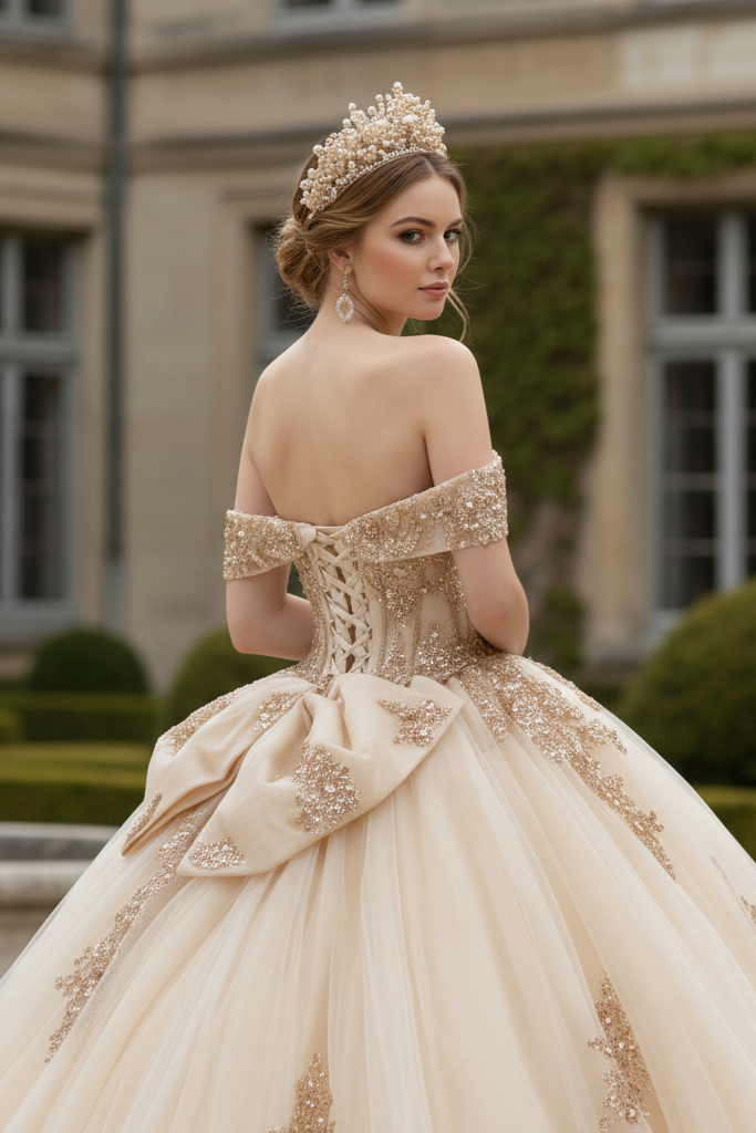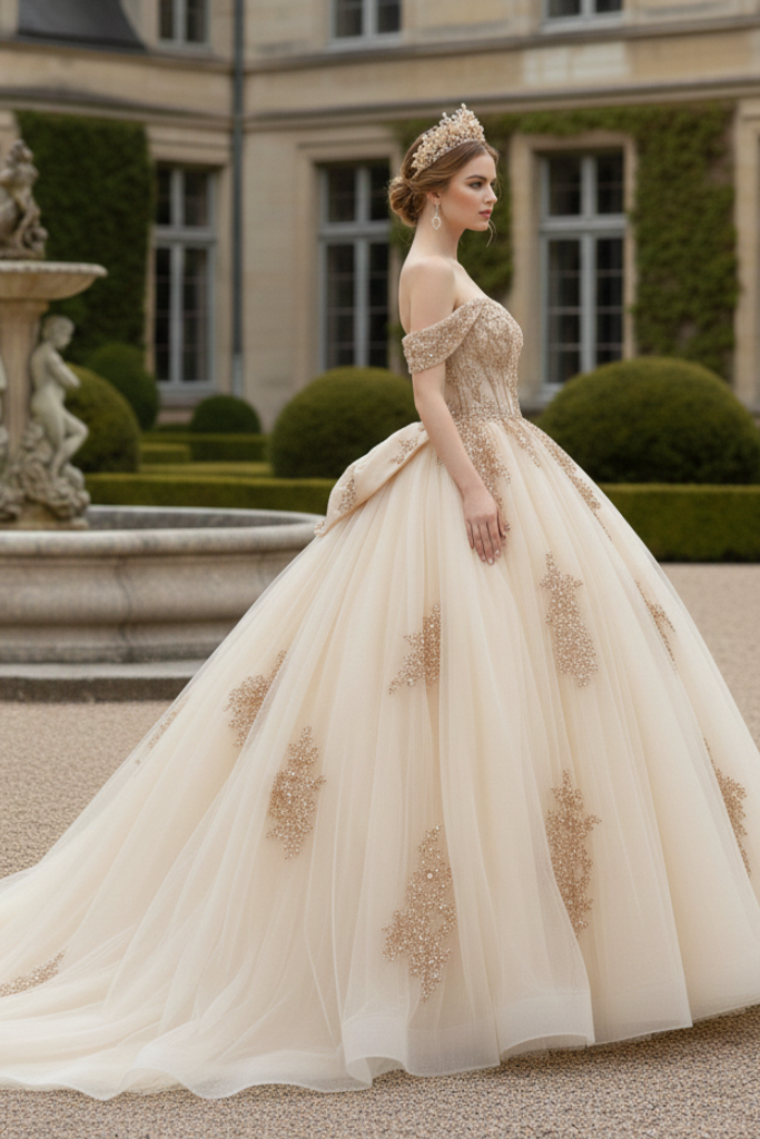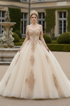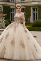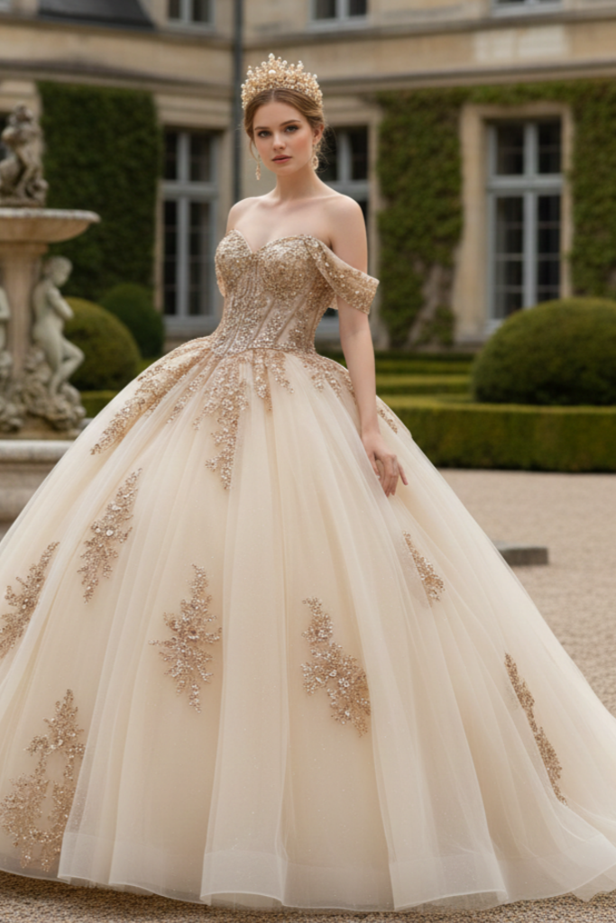 Radiating refined luxury and timeless grace, this champagne gold ball gown is designed to make your celebration truly unforgettable. The off-shoulder sweetheart bodice is intricately embellished with shimmering gold embroidery, creating a luminous, couture-inspired finish. Soft layers of airy tulle form a voluminous princess silhouette, flowing effortlessly into a dramatic floor-length skirt that captures light with every step.The open lace-up corset back not only enhances the gown’s romantic appeal but also offers an adjustable, sculpted fit for ultimate comfort and elegance. A perfect harmony of classic royalty and modern sophistication.