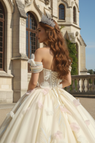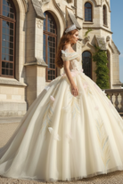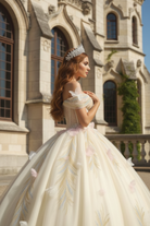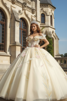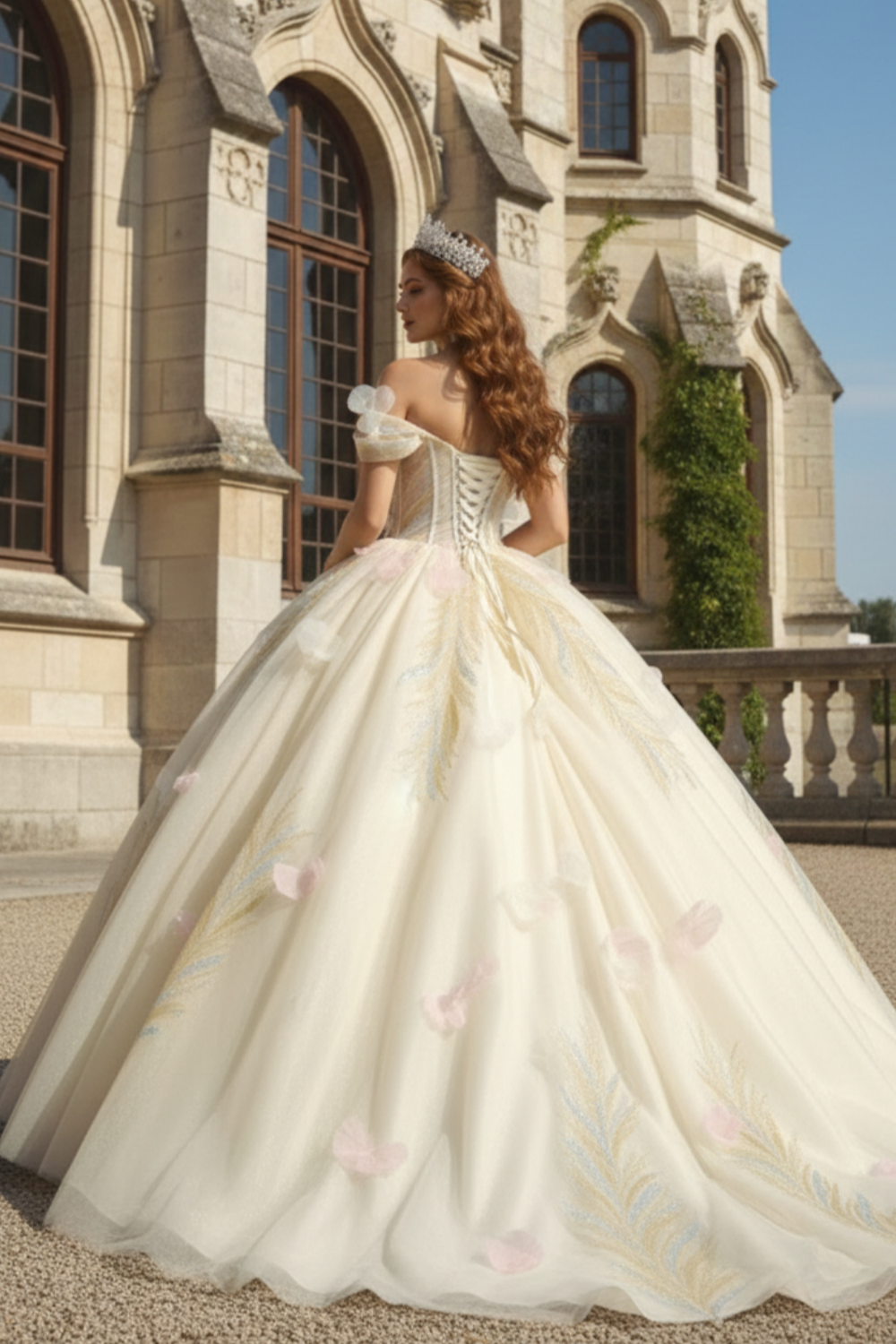 Crafted in soft champagne tulle, this regal ball gown features a sculpted sweetheart corset bodice with delicate pastel embroidery and airy off-the-shoulder details. The voluminous skirt flows gracefully, creating a refined princess silhouette. Finished with an open lace-up corset back for an adjustable, flattering fit.
