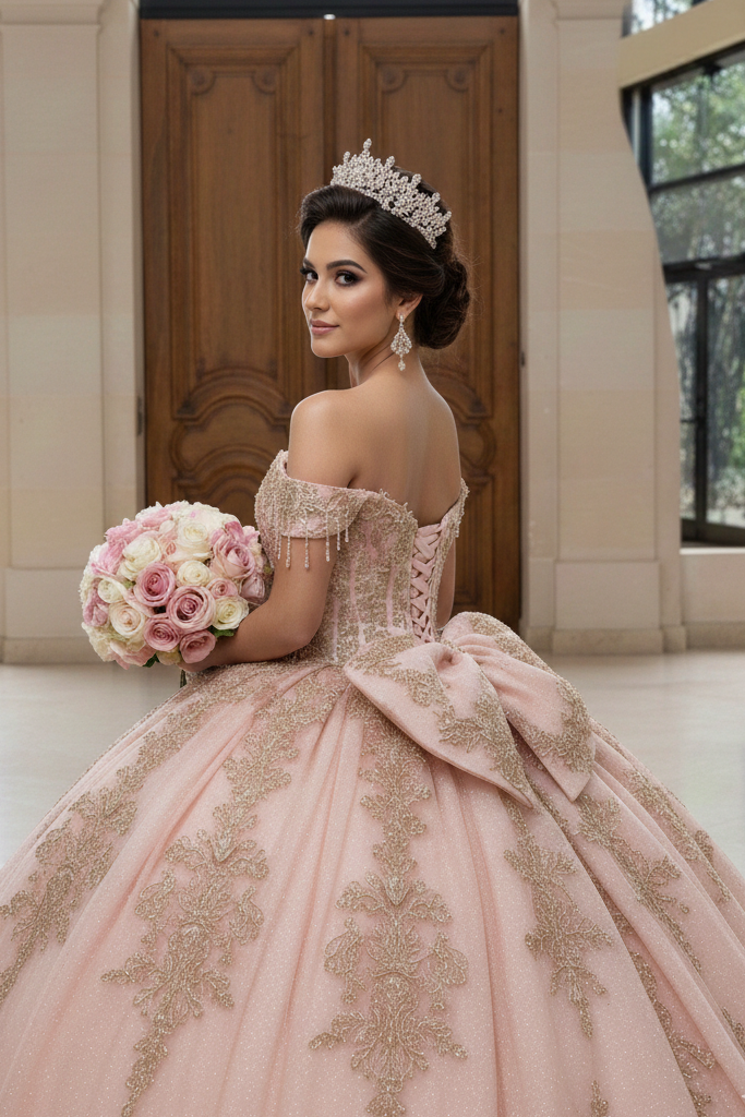 Designed for a truly unforgettable entrance, this regal blush pink ball gown embodies timeless elegance and modern couture artistry. The structured sweetheart bodice is richly adorned with intricate gold embroidery, creating a luminous contrast against soft layers of airy tulle. Delicate off-shoulder sleeves enhance the romantic silhouette, while the voluminous skirt flows into a dramatic floor-length finish fit for royalty.The craftsmanship continues at the back with an open lace-up corset design, offering both refined detail and an adjustable, sculpted fit. Every element of this gown is created to celebrate grace, confidence, and the beauty of your milestone moment.