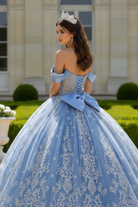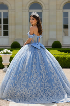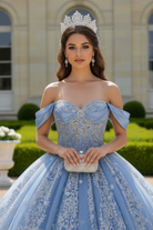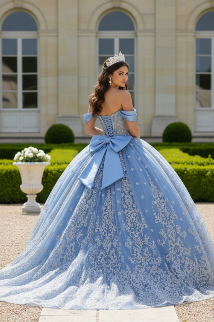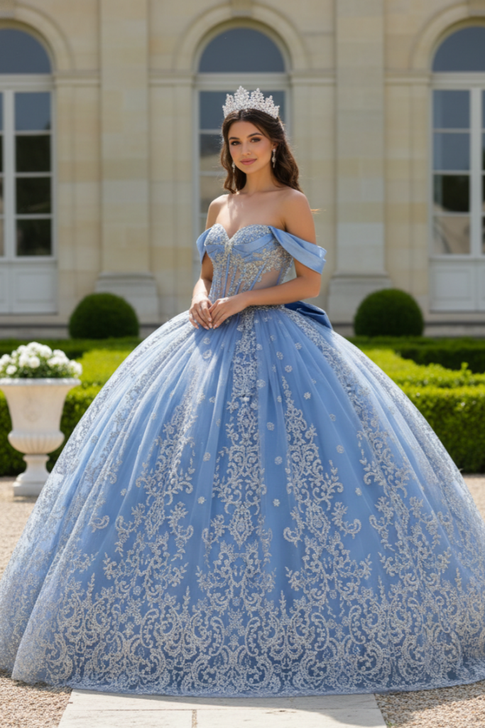 A breathtaking expression of regal elegance, this dusty blue princess gown enchants with its intricate lace artistry and timeless silhouette. The off-shoulder sweetheart neckline frames the shoulders beautifully, while the structured corset bodice enhances the waist with refined sophistication. The voluminous lace-embroidered skirt creates a grand, fairy-tale presence worthy of a royal celebration.