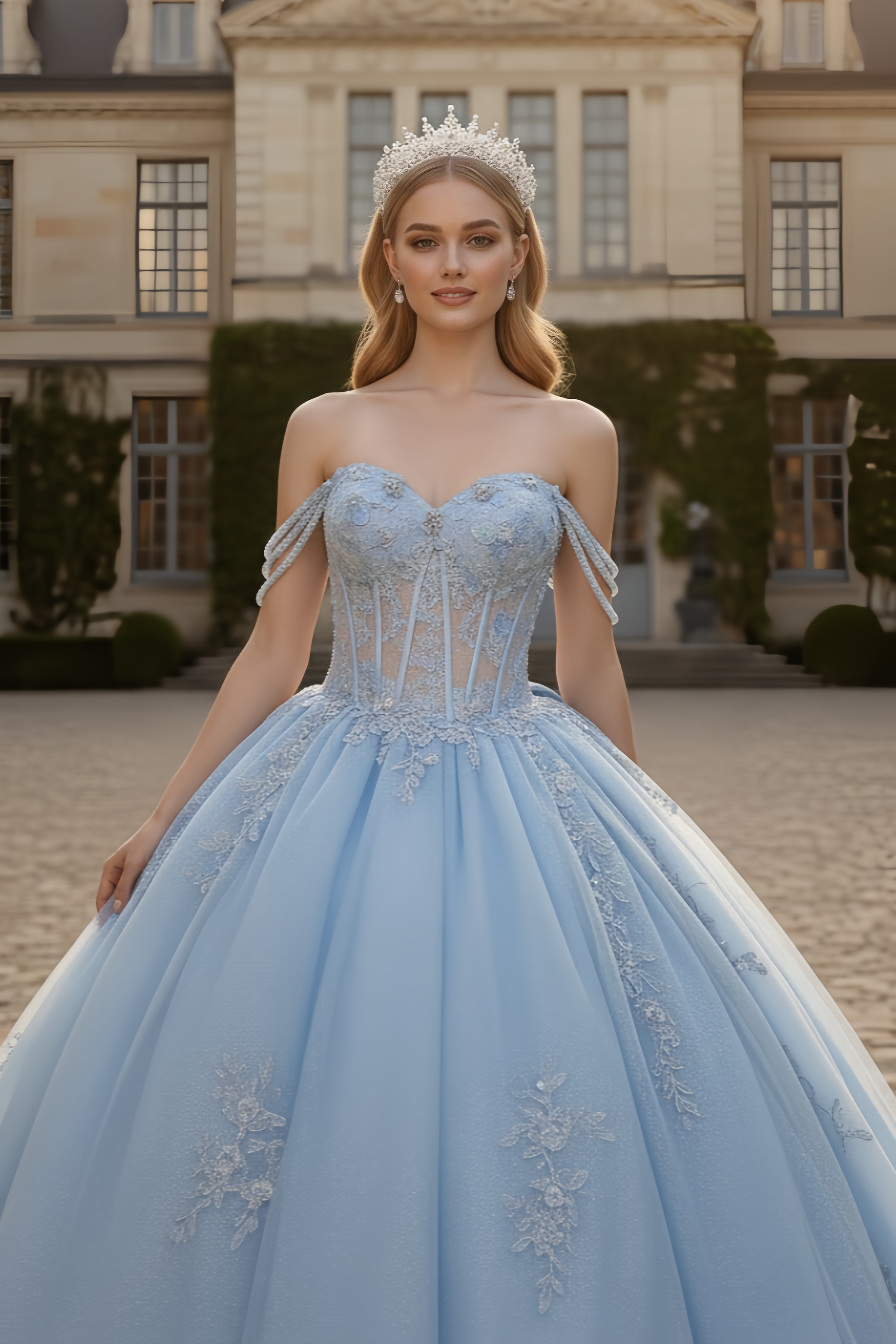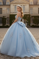 Gracefully crafted for a grand entrance, this ice blue princess gown embodies timeless royalty and modern sophistication. The structured sweetheart corset bodice features delicate shimmering embroidery that sculpts the waist and enhances the silhouette. Soft off-shoulder draped straps add an ethereal touch, while the voluminous glitter tulle skirt flows into a breathtaking floor-length finish. The open lace-up back ensures an adjustable, figure-enhancing fit for your most unforgettable celebration.